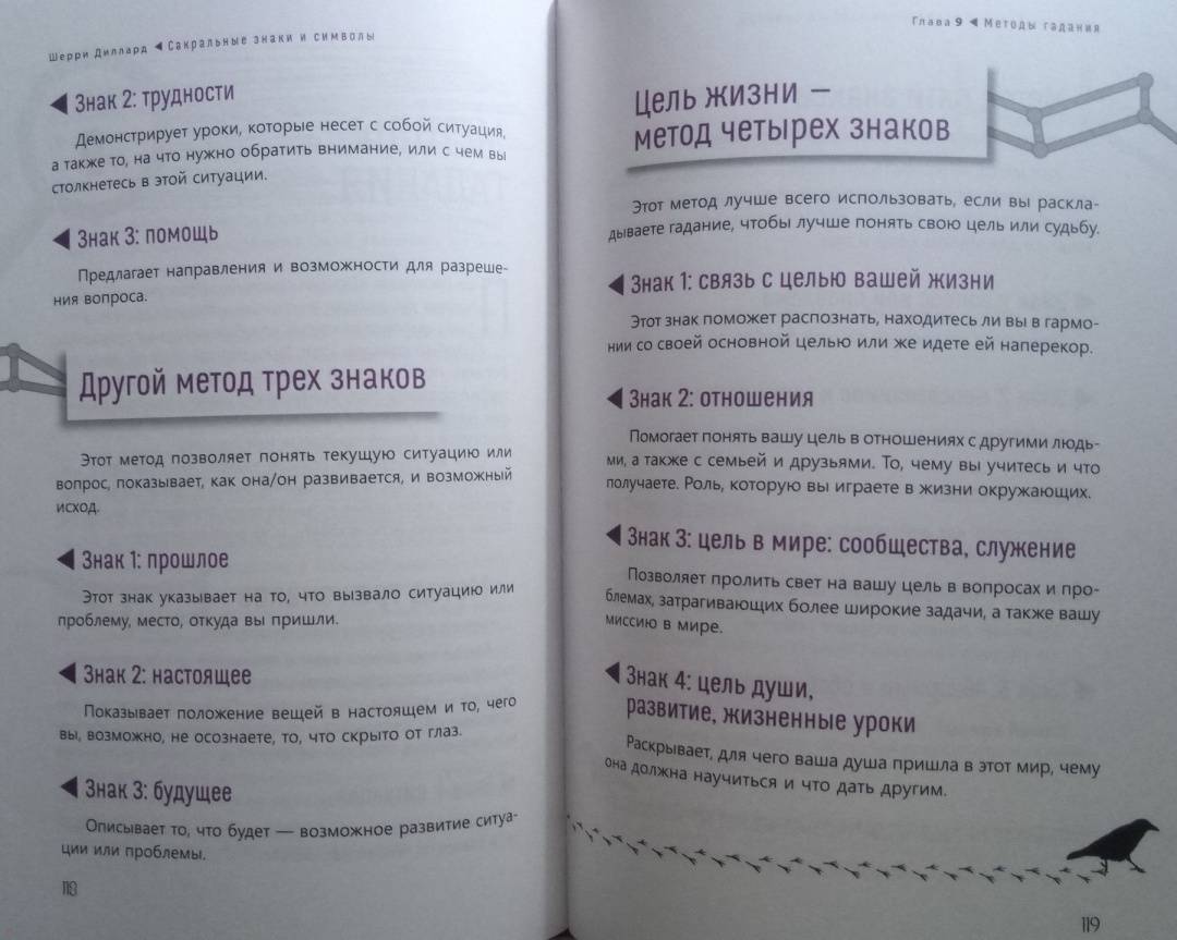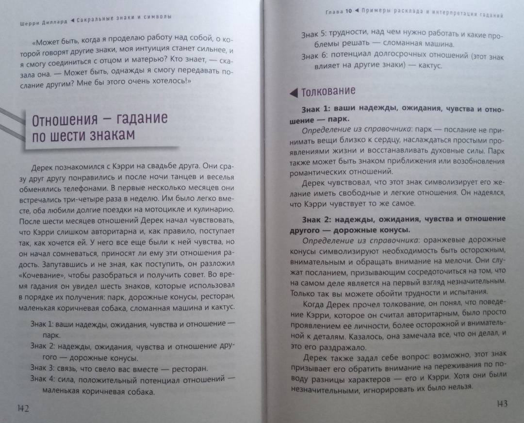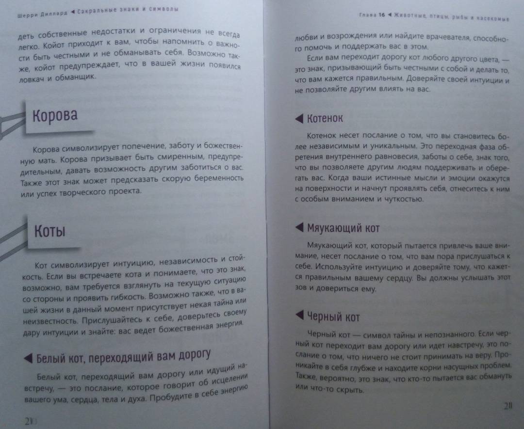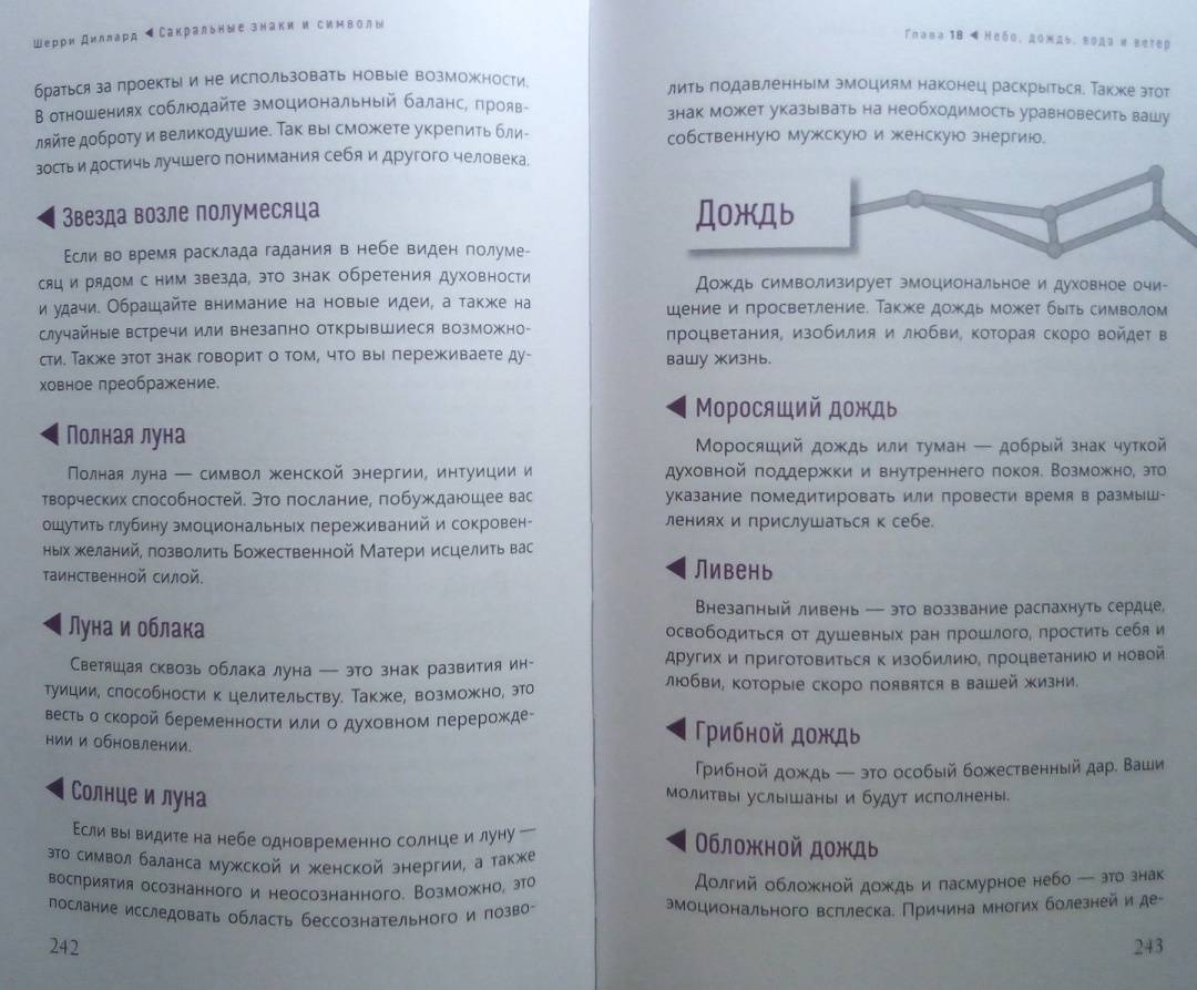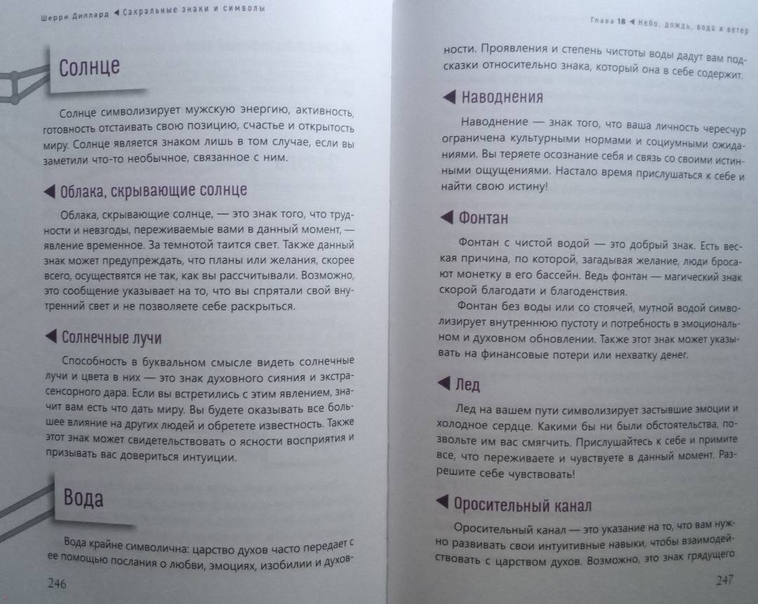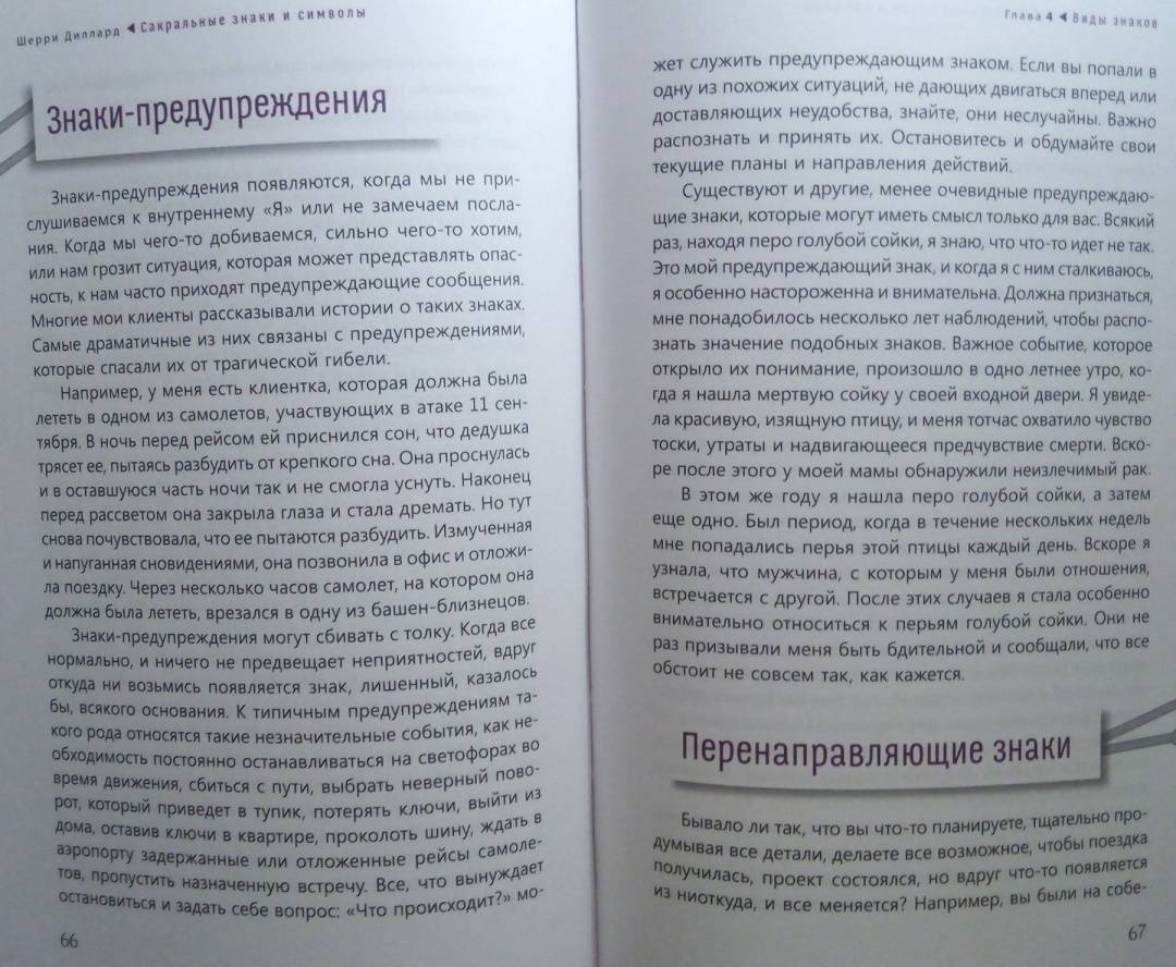ОписаниеКогда вы находили монеты или перья, задавались ли вы когда-нибудь вопросом: "Может быть, кто-то или что-то подает мне знак?" Бывало ли так, чтобы одни и те же птицы прилетали к вашему окну слишком часто, чтобы считать это простым совпадением? Возможно, вы несколько ночей подряд просыпались в одно и то же время, а затем обращали внимание, что и днем смотрите на часы, которые показывают ровно это же время? Собираясь сделать непростой выбор или принять важное решение, или переживая кризис, просите ли вы, чтобы Вселенная подала вам знак или оставила послание?С начала времен человек обращается к невидимой силе, которая могла бы направить и утешить, оставляя свои "сообщения". Когда вы замечаете знаки и понимаете их смысл, вы приоткрываете для себя глубинные тайны жизни и начинаете осознавать, что Вселенная знает о вас, видит вас и помогает.Шерри ДиллардО чем книгаШерри Диллард - медиум и экстрасенс с более чем 20-летним опытом, автор книг по раскрытию дара интуиции и экстрасенсорных способностей. В книге "Сакральные знаки и символы" она рассказывает, как замечать и понимать знаки Вселенной и таким образом получать помощь и поддержку высших сил.Знаком может быть что угодно в окружающем мире: предметы, растения и животные, рекламные вывески и информационные табло, цифры, цвета, транспорт, природные явления, запахи и звуки, и даже события и действия. Вас может удивить, но запах гари символизирует начало нового пути, а услышанный плач ребенка означает скрытый стресс и разочарование. Воздушные шары напоминают, что следует наслаждаться маленькими радостями жизни, а забор с колючей проволокой указывает на то, что кто-то пытается вас контролировать. Монетки часто являются знаком от умершего близкого человека, а если вы увидели такси, будьте уверены, что вы можете рассчитывать на помощь других людей.Из первых двух частей книги вы узнаете, как научиться принимать сообщения от духовного мира и освоите метод "Живое гадание". В отличие от знаков, которые приходят спонтанно, система "Живого гадания" призывает знаки и послания, чтобы получить конкретную подсказку и помощь, разрешить проблему или глубже понять определенную сферу жизни. В третьей части книги приводится обширный справочник с толкованиями знаков. Знаки сгруппированы по областям и даются в алфавитном порядке. Вы легко найдете нужную информацию.Почему книгу стоит прочитатьВы сможете ощутить поддержку высших сил - Вселенной, мира духов, коллективного бессознательного. Знаки и совпадения станут указателями и помогут ориентироваться в жизни. Вовремя замеченный и правильно истолкованный знак способен уберечь от неприятной ситуации, обратить ваше внимание на что-либо важное для вас, побудить к каким-либо действиям.Например, вы увидели вертолет в небе? Отлично - помощь и поддержка царства духов рядом. Белое перышко прилетело словно ниоткуда? Ангел-хранитель заботится о вас прямо сейчас. Вам повстречалась маленькая собачка, идущая на поводке - это знак, что вы уже обладаете качествами и ресурсами, необходимыми для достижения цели. Стрекоза призывает вас исследовать свои мысли, осознать подавленные убеждения и установки. Лежащая на земле сухая ветка - знак того, что вы отрезаны от своей силы и не замечаете этого. А если вы попали под грибной дождь, радуйтесь - это особый божественный дар: в