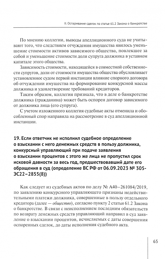 ОписаниеВ данный обзор судебной практики вошло описание судебных актов по делам о банкротстве за 2023 год. Для включения в обзор были выбраны судебные акты, в которых Верховный Суд РФ выразил правовые позиции, рассчитанные на применение в других обособленных спорах, так называемые "практикообразующие" судебные решения. Для удобства использования обзор разбит на разные главы по основным темам судебной практики по делам о банкротстве.Обзор судебной практики будет полезен для практикующих юристов, которые смогут подыскивать необходимые правовые позиции Верховного Суда РФ, однако для полного уяснения содержания выводов высшей судебной инстанции рекомендуется ознакомление с цитируемыми судебными актами.Ключевые слова: судебная практика, правовые позиции Верховного Суда РФ, банкротство, практикообразующие судебные акты.В данный обзор судебной практики вошло описание судебных актов по делам о банкротстве за 2023 год. Для включения в обзор были выбраны судебные акты, в которых Верховный Суд РФ выразил правовые позиции, рассчитанные на применение в других обособленных спорах, так называемые "практикообразующие" судебные решения. Для удобства использования обзор разбит на разные главы по основным темам судебной практики по делам о банкротстве.Обзор судебной практики будет полезен для практикующих юристов, которые смогут подыскивать необходимые правовые позиции Верховного Суда РФ, однако для полного уяснения содержания выводов высшей судебной инстанции рекомендуется ознакомление с цитируемыми судебными актами.Ключевые слова: судебная практика, правовые позиции Верховного Суда РФ, банкротство, практикообразующие судебные акты.