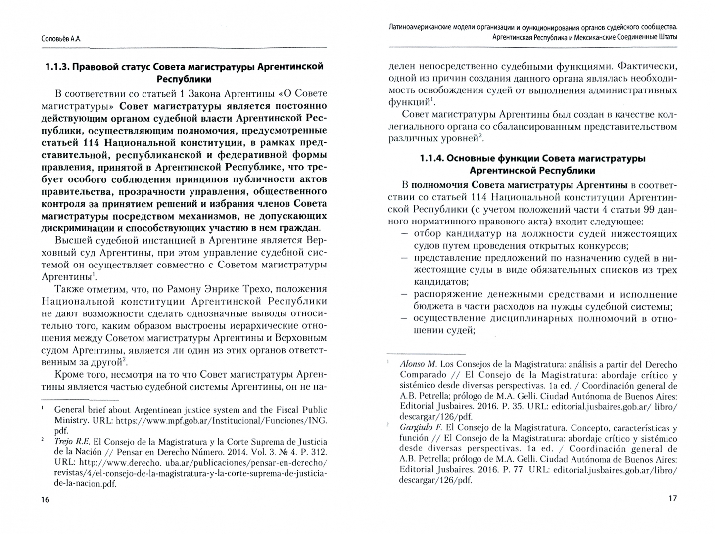 ОписаниеВ настоящем издании автор продолжает сравнительно-правовое исследование проблем организации и функционирования органов судейского сообщества зарубежных государств: Аргентинской Республики (на федеральном уровне и на уровне субъектов федерации), а также Мексиканских Соединенных Штатов.В приложении приведены авторские переводы актуальных редакций Закона Аргентинской Республики «О Совете магистратуры» и титула 6 «Органы управления системой судебной власти Федерации» Органического закона Мексиканских Соединенных Штатов «О федеральной судебной власти».Предназначена для научных работников, преподавателей, аспирантов, магистрантов и студентов юридических вузов, специализирующихся на вопросах теории права и государства, конституционного, административного, гражданского процессуального права, а также проблемах судебной власти. Также может быть полезна для лиц, участвующих в правотворческой деятельности, судей, работников судебной системы, адвокатов, практикующих юристов, руководителей и работников органов государственной власти и местного самоуправления, а также для всех, кто интересуется указанным кругом вопросов.СвернутьВ настоящем издании автор продолжает сравнительно-правовое исследование проблем организации и функционирования органов судейского сообщества зарубежных государств: Аргентинской Республики (на федеральном уровне и на уровне субъектов федерации), а также Мексиканских Соединенных Штатов.В приложении приведены авторские переводы актуальных редакций Закона Аргентинской Республики «О Совете магистратуры» и титула 6 «Органы управления системой судебной власти Федерации» Органического закона Мексиканских Соединенных Штатов «О федеральной судебной власти».Предназначена для научных работников, преподавателей, аспирантов, магистрантов и студентов юридических вузов, специализирующихся на вопросах теории права и государства, конституционного, административного, гражданского процессуального права, а также проблемах судебной власти. Также может быть полезна для лиц, участвующих в правотворческой деятельности, судей, работников судебной системы, адвокатов, практикующих юристов, руководителей и работников органов государственной власти и местного самоуправления, а также для всех, кто интересуется указанным кругом вопросов.СвернутьСвернуть