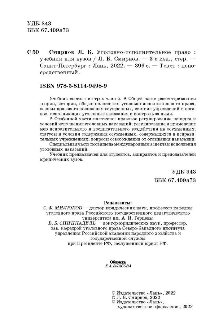 -Леонид Смирнов: Уголовно-исполнительное право. Учебник для вузовСудебная системаАдвокатура. НотариатЮриспруденцияПравоохранительные органы. КриминалистикаКонституционное правоОхрана трудаГосударственное правоТрудовое право. Право социального обеспеченияЭкологическое, лесное, водное, горное правоИнтеллектуальное правоГосударственное и муниципальное управлениеЗемельное правоЖилищное, семейное правоАдминистративное правоТеория и история государства и праваМеждународное правоОсобые виды праваЮридическая консультацияЗаконы, кодексы и комментарииГражданское право