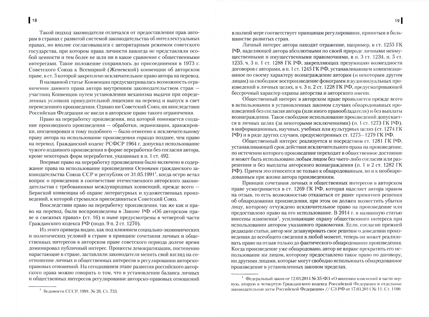 ОписаниеПоследовательно излагаются все ключевые темы авторского права и смежных с ним прав. Рассматриваются объекты названных прав, очерчивается круг субъектов авторско-правовых отношений и обладателей смежных прав. Подробно излагаются вопросы их классификации и содержания, сроки правовой охраны и границы осуществления данных прав, а также способы защиты. Отражается система авторско-правовых договоров, рассматриваются отношения по коллективному управлению авторскими и смежными правами.Включает в себя задания для подготовки и проведения аудиторных занятий и самостоятельной работы студентов (практикум): задачи, творческие задания, составление таблиц, схем, анализ судебных актов, сюжеты для проведения «круглых столов», тесты, темы для эссе, контрольные вопросы по темам.Подготовлено на основе обновленного законодательства и с учетом постановления Пленума Верховного Суда РФ от 23 апреля 2019 года «О применении части четвертой Гражданского кодекса Российской Федерации».Соответствует ФГОС ВО последнего поколения.Для студентов бакалавриата, обучающихся по направлению «Юриспруденция» и для студентов специалитета, обучающихся по специальности «Юриспруденция».СвернутьПоследовательно излагаются все ключевые темы авторского права и смежных с ним прав. Рассматриваются объекты названных прав, очерчивается круг субъектов авторско-правовых отношений и обладателей смежных прав. Подробно излагаются вопросы их классификации и содержания, сроки правовой охраны и границы осуществления данных прав, а также способы защиты. Отражается система авторско-правовых договоров, рассматриваются отношения по коллективному управлению авторскими и смежными правами.Включает в себя задания для подготовки и проведения аудиторных занятий и самостоятельной работы студентов (практикум): задачи, творческие задания, составление таблиц, схем, анализ судебных актов, сюжеты для проведения «круглых столов», тесты, темы для эссе, контрольные вопросы по темам.Подготовлено на основе обновленного законодательства и с учетом постановления Пленума Верховного Суда РФ от 23 апреля 2019 года «О применении части четвертой Гражданского кодекса Российской Федерации».Соответствует ФГОС ВО последнего поколения.Для студентов бакалавриата, обучающихся по направлению «Юриспруденция» и для студентов специалитета, обучающихся по специальности «Юриспруденция».СвернутьСвернуть