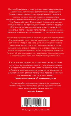 ОписаниеНикколо Макиавелли - один из самых известных итальянских мыслителей и политических деятелей эпохи Возрождения (занимал во Флоренции пост государственного секретаря), писатель, историк, военный теоретик, создавший ряд историко-политических сочинений ("Рассуждения о первой декаде Тита Ливия", "История Флоренции"). Самым значительным и неоднозначным его произведением стал трактат "Государь". Долгие годы эта книга ассоциировалась с политикой яда и кинжала, а после ее выхода появился термин "макиавеллизм", обозначающий цинизм, вседозволенность, двуличие в политике. Настоящее издание знакомит читателя с трактатом Макиавелли "О военном искусстве", стоящим в одном ряду с величайшими работами по теории военного дела. Именно здесь впервые звучат идеи, важность которых для последующей истории западного мира трудно переоценить и которые подкреплены множеством примеров великих побед и поражений древности.Трактат "О военном искусстве" представлен в новом переводе и сопровождается статьей и подробными примечаниями.СвернутьНикколо Макиавелли - один из самых известных итальянских мыслителей и политических деятелей эпохи Возрождения (занимал во Флоренции пост государственного секретаря), писатель, историк, военный теоретик, создавший ряд историко-политических сочинений ("Рассуждения о первой декаде Тита Ливия", "История Флоренции"). Самым значительным и неоднозначным его произведением стал трактат "Государь". Долгие годы эта книга ассоциировалась с политикой яда и кинжала, а после ее выхода появился термин "макиавеллизм", обозначающий цинизм, вседозволенность, двуличие в политике. Настоящее издание знакомит читателя с трактатом Макиавелли "О военном искусстве", стоящим в одном ряду с величайшими работами по теории военного дела. Именно здесь впервые звучат идеи, важность которых для последующей истории западного мира трудно переоценить и которые подкреплены множеством примеров великих побед и поражений древности.Трактат "О военном искусстве" представлен в новом переводе и сопровождается статьей и подробными примечаниями.СвернутьСвернуть