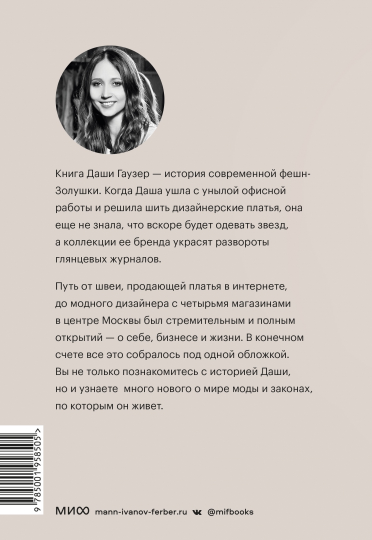 ОписаниеКнига Даши Гаузер - история современной фешн-Золушки. Когда она ушла с унылой офисной работы и решила шить дизайнерские платья, она еще не знала, что вскоре будет одевать звезд, а коллекции ее бренда украсят развороты глянцевых журналов. Путь от швеи, продающей платья в интернете, до модного дизайнера с четырьмя магазинами в центре Москвы был стремительным и полным открытий - о себе, бизнесе и жизни. В конечном счете все это собралось под одной обложкой. Вы не только познакомитесь с историей Даши, но и узнаете много нового о мире моды и законах, по которым он живет.Книга Даши Гаузер - история современной фешн-Золушки. Когда она ушла с унылой офисной работы и решила шить дизайнерские платья, она еще не знала, что вскоре будет одевать звезд, а коллекции ее бренда украсят развороты глянцевых журналов. Путь от швеи, продающей платья в интернете, до модного дизайнера с четырьмя магазинами в центре Москвы был стремительным и полным открытий - о себе, бизнесе и жизни. В конечном счете все это собралось под одной обложкой. Вы не только познакомитесь с историей Даши, но и узнаете много нового о мире моды и законах, по которым он живет.