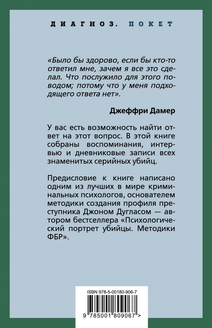 Описание"Было бы здорово, если бы кто-то ответил мне, зачем я все это сделал. Что послужило для этого поводом; потому что у меня подходящего ответа нет". - Джеффри Дамер У вас есть возможность найти ответ на этот вопрос. В этой книге собраны воспоминания, интервью и дневниковые записи всех знаменитых серийных убийц. Предисловие к книге написано одним из лучших криминальных психологов в мире, основателем методики создания профиля преступника Джоном Дугласом - автором бестселлера "Психологический портрет убийцы. Методики ФБР"."Было бы здорово, если бы кто-то ответил мне, зачем я все это сделал. Что послужило для этого поводом; потому что у меня подходящего ответа нет". - Джеффри Дамер У вас есть возможность найти ответ на этот вопрос. В этой книге собраны воспоминания, интервью и дневниковые записи всех знаменитых серийных убийц. Предисловие к книге написано одним из лучших криминальных психологов в мире, основателем методики создания профиля преступника Джоном Дугласом - автором бестселлера "Психологический портрет убийцы. Методики ФБР".