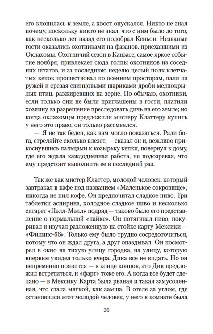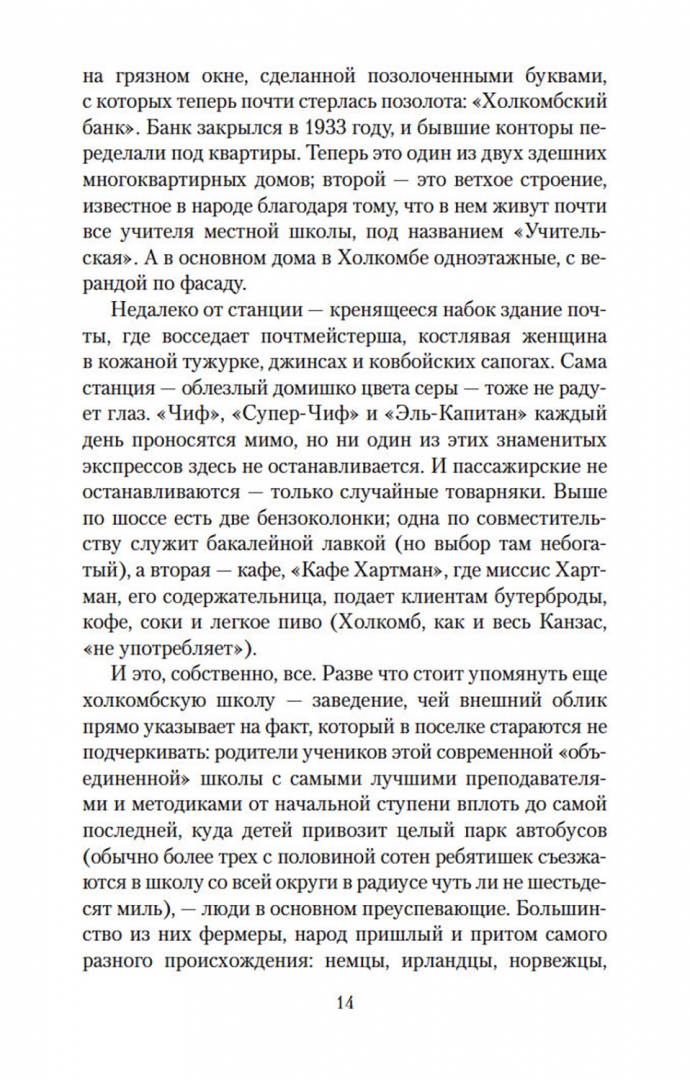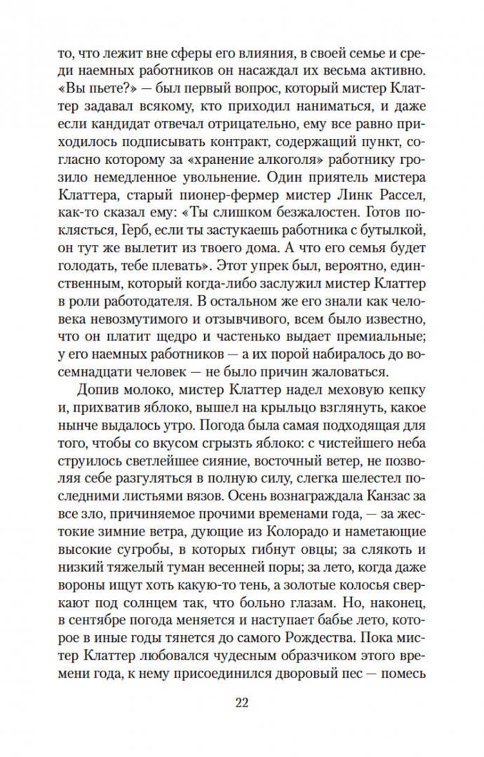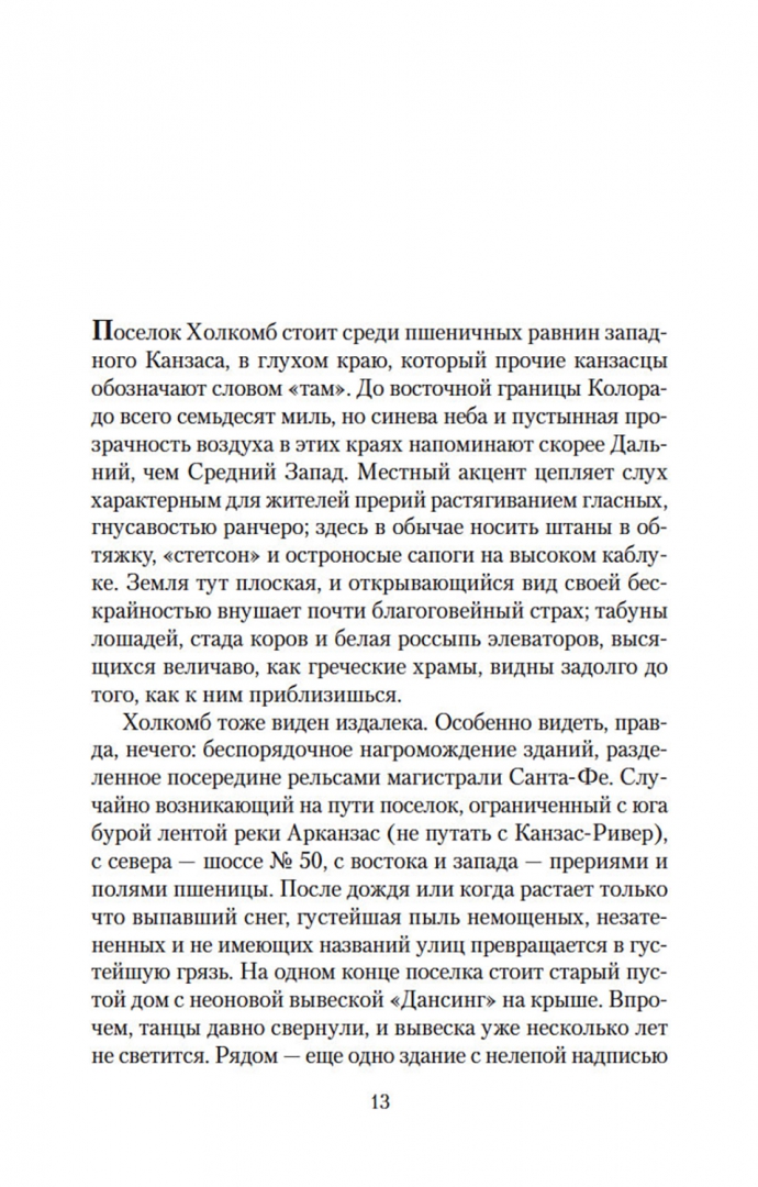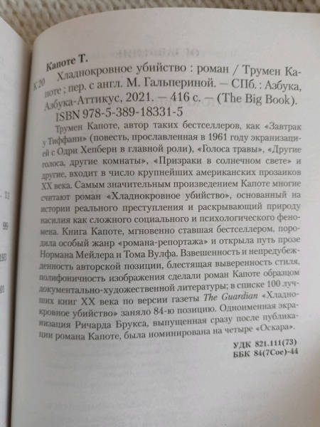ОписаниеТрумен Капоте, автор таких бестселлеров, как «Завтрак у Тиффани» (повесть, прославленная в 1961 году экранизацией с Одри Хепберн в главной роли), «Голоса травы», «Другие голоса, другие комнаты», «Призраки в солнечном свете» и другие, входит в число крупнейших американских прозаиков XX века. Самым значительным произведением Капоте многие считают роман «Хладнокровное убийство», основанный на истории реального преступления и раскрывающий природу насилия как сложного социального и психологического феномена. Книга Капоте, мгновенно ставшая бестселлером, породила особый жанр «романа-репортажа» и открыла путь прозе Нормана Мейлера и Тома Вулфа. Взвешенность и непредубежденность авторской позиции, блестящая выверенность стиля, полифоничность изображения сделали роман Капоте образцом документально-художественной литературы; в списке 100 лучших книг XX века по версии газеты The Guardian «Хладнокровное убийство» заняло 84-ю позицию. Одноименная экранизация Ричарда Брукса, выпущенная сразу после публикации романа Капоте, была номинирована на четыре «Оскара».СвернутьТрумен Капоте, автор таких бестселлеров, как «Завтрак у Тиффани» (повесть, прославленная в 1961 году экранизацией с Одри Хепберн в главной роли), «Голоса травы», «Другие голоса, другие комнаты», «Призраки в солнечном свете» и другие, входит в число крупнейших американских прозаиков XX века. Самым значительным произведением Капоте многие считают роман «Хладнокровное убийство», основанный на истории реального преступления и раскрывающий природу насилия как сложного социального и психологического феномена. Книга Капоте, мгновенно ставшая бестселлером, породила особый жанр «романа-репортажа» и открыла путь прозе Нормана Мейлера и Тома Вулфа. Взвешенность и непредубежденность авторской позиции, блестящая выверенность стиля, полифоничность изображения сделали роман Капоте образцом документально-художественной литературы; в списке 100 лучших книг XX века по версии газеты The Guardian «Хладнокровное убийство» заняло 84-ю позицию. Одноименная экранизация Ричарда Брукса, выпущенная сразу после публикации романа Капоте, была номинирована на четыре «Оскара».СвернутьСвернуть