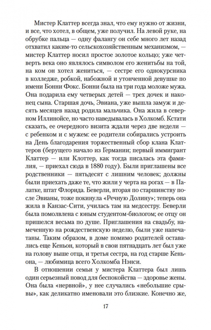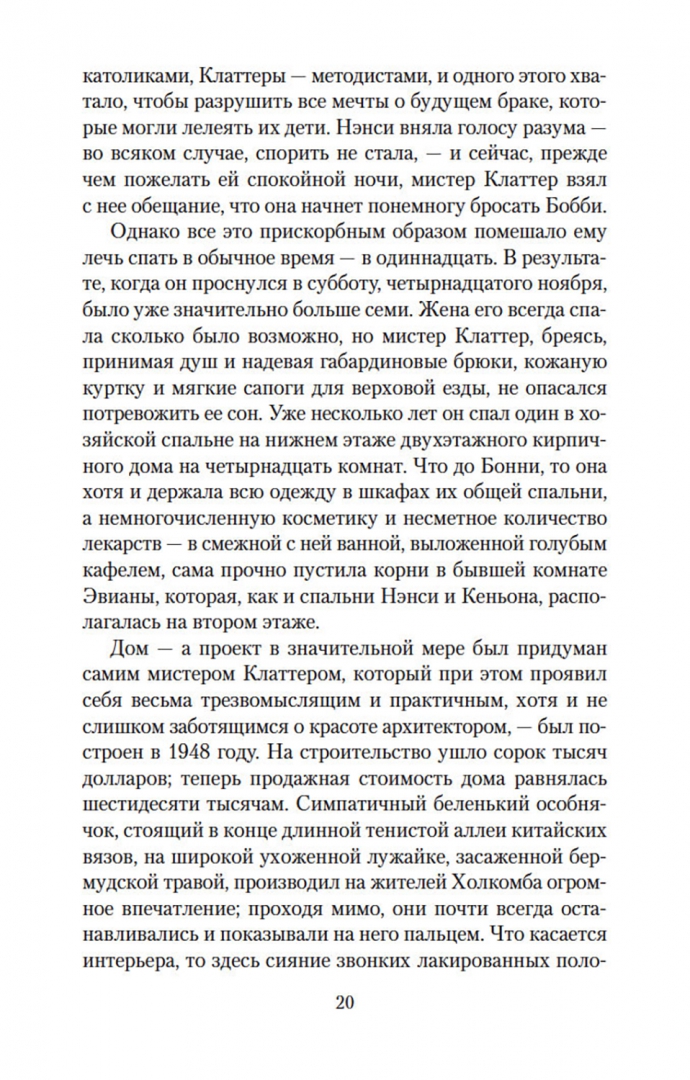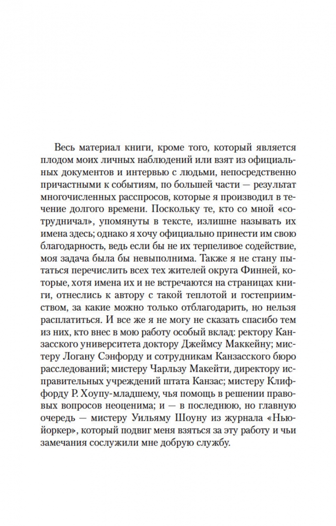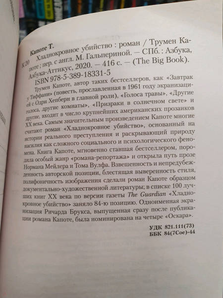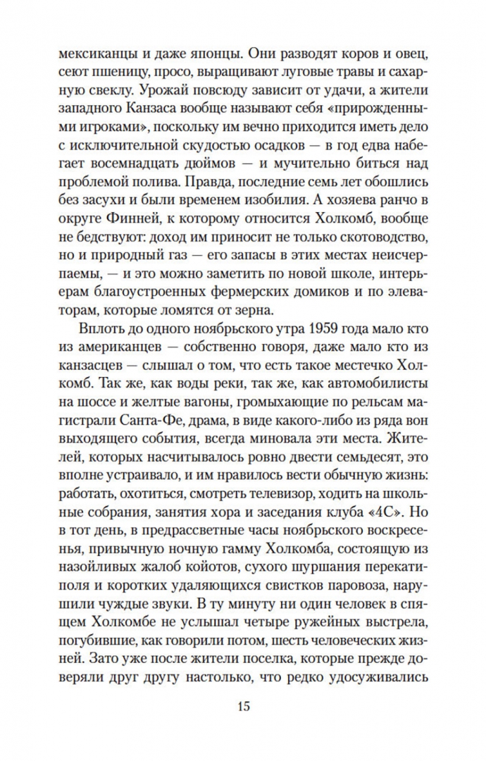 ОписаниеТрумен Капоте, автор таких бестселлеров, как «Завтрак у Тиффани» (повесть, прославленная в 1961 году экранизацией с Одри Хепберн в главной роли), «Голоса травы», «Другие голоса, другие комнаты», «Призраки в солнечном свете» и другие, входит в число крупнейших американских прозаиков XX века. Самым значительным произведением Капоте многие считают роман «Хладнокровное убийство», основанный на истории реального преступления и раскрывающий природу насилия как сложного социального и психологического феномена. Книга Капоте, мгновенно ставшая бестселлером, породила особый жанр «романа-репортажа» и открыла путь прозе Нормана Мейлера и Тома Вулфа. Взвешенность и непредубежденность авторской позиции, блестящая выверенность стиля, полифоничность изображения сделали роман Капоте образцом документально-художественной литературы; в списке 100 лучших книг XX века по версии газеты The Guardian «Хладнокровное убийство» заняло 84-ю позицию. Одноименная экранизация Ричарда Брукса, выпущенная сразу после публикации романа Капоте, была номинирована на четыре «Оскара».СвернутьТрумен Капоте, автор таких бестселлеров, как «Завтрак у Тиффани» (повесть, прославленная в 1961 году экранизацией с Одри Хепберн в главной роли), «Голоса травы», «Другие голоса, другие комнаты», «Призраки в солнечном свете» и другие, входит в число крупнейших американских прозаиков XX века. Самым значительным произведением Капоте многие считают роман «Хладнокровное убийство», основанный на истории реального преступления и раскрывающий природу насилия как сложного социального и психологического феномена. Книга Капоте, мгновенно ставшая бестселлером, породила особый жанр «романа-репортажа» и открыла путь прозе Нормана Мейлера и Тома Вулфа. Взвешенность и непредубежденность авторской позиции, блестящая выверенность стиля, полифоничность изображения сделали роман Капоте образцом документально-художественной литературы; в списке 100 лучших книг XX века по версии газеты The Guardian «Хладнокровное убийство» заняло 84-ю позицию. Одноименная экранизация Ричарда Брукса, выпущенная сразу после публикации романа Капоте, была номинирована на четыре «Оскара».СвернутьСвернуть