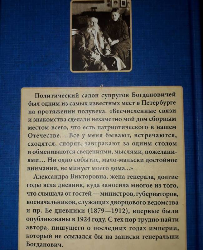 ОписаниеБогдановичей - Евгения Васильевича (1829-1914) и его жену Александру Викторовну (1846-1914) - знал весь Петербург.Генерал Богданович, чиновник министерства внутренних дел, тайный советник, староста Исаакиевского собора, рьяный монархист, издатель и публицист, был хозяином известнейшего политического салона, просуществовавшего более полувека - с 1860-х годов почти до Первой мировой войны. "Бесчисленные связи и знакомства сделали незаметно мой дом сборным местом всего, что есть патриотического в нашем Отечестве... Все у меня бывают, встречаются, сходятся, спорят, завтракают за одним столом и обмениваются сведениями, мыслями, пожеланиями... Ни одно событие, мало-мальски достойное внимания, не минует моего дома, и нет ни одной газеты, которая не отставала бы от разговоров "у генерала Богдановича"".Вследствие этого Богдановичи были весьма осведомленными людьми, а Александра Викторовна долгие годы вела дневник, куда аккуратно и тщательно заносила многое из того, что слышала от гостей - министров, губернаторов, военачальников, служащих дворцового ведомства, церковных иерархов, дипломатов, журналистов, коммерсантов, депутатов и пр.Ее записи (политического, светского, бытового характера), находящиеся в Российском государственном историческом архиве в Санкт-Петербурге, исчисляются сотнями. Дневники, охватывающие события с 1879 по 1912 год (с купюрами и без тетрадей за 1882-1887 гг., которые, вероятно, утрачены), впервые были опубликованы под названием "Три последних самодержца" в 1924 году. С тех пор трудно найти автора, пишущего о последних годах империи, который не ссылался бы на записки генеральши Богданович.СвернутьБогдановичей - Евгения Васильевича (1829-1914) и его жену Александру Викторовну (1846-1914) - знал весь Петербург.Генерал Богданович, чиновник министерства внутренних дел, тайный советник, староста Исаакиевского собора, рьяный монархист, издатель и публицист, был хозяином известнейшего политического салона, просуществовавшего более полувека - с 1860-х годов почти до Первой мировой войны. "Бесчисленные связи и знакомства сделали незаметно мой дом сборным местом всего, что есть патриотического в нашем Отечестве... Все у меня бывают, встречаются, сходятся, спорят, завтракают за одним столом и обмениваются сведениями, мыслями, пожеланиями... Ни одно событие, мало-мальски достойное внимания, не минует моего дома, и нет ни одной газеты, которая не отставала бы от разговоров "у генерала Богдановича"".Вследствие этого Богдановичи были весьма осведомленными людьми, а Александра Викторовна долгие годы вела дневник, куда аккуратно и тщательно заносила многое из того, что слышала от гостей - министров, губернаторов, военачальников, служащих дворцового ведомства, церковных иерархов, дипломатов, журналистов, коммерсантов, депутатов и пр.Ее записи (политического, светского, бытового характера), находящиеся в Российском государственном историческом архиве в Санкт-Петербурге, исчисляются сотнями. Дневники, охватывающие события с 1879 по 1912 год (с купюрами и без тетрадей за 1882-1887 гг., которые, вероятно, утрачены), впервые были опубликованы под названием "Три последних самодержца" в 1924 году. С тех пор трудно найти автора, пишущего о последних годах империи, который не ссылался бы на записки генеральши Богданович.СвернутьСвернуть