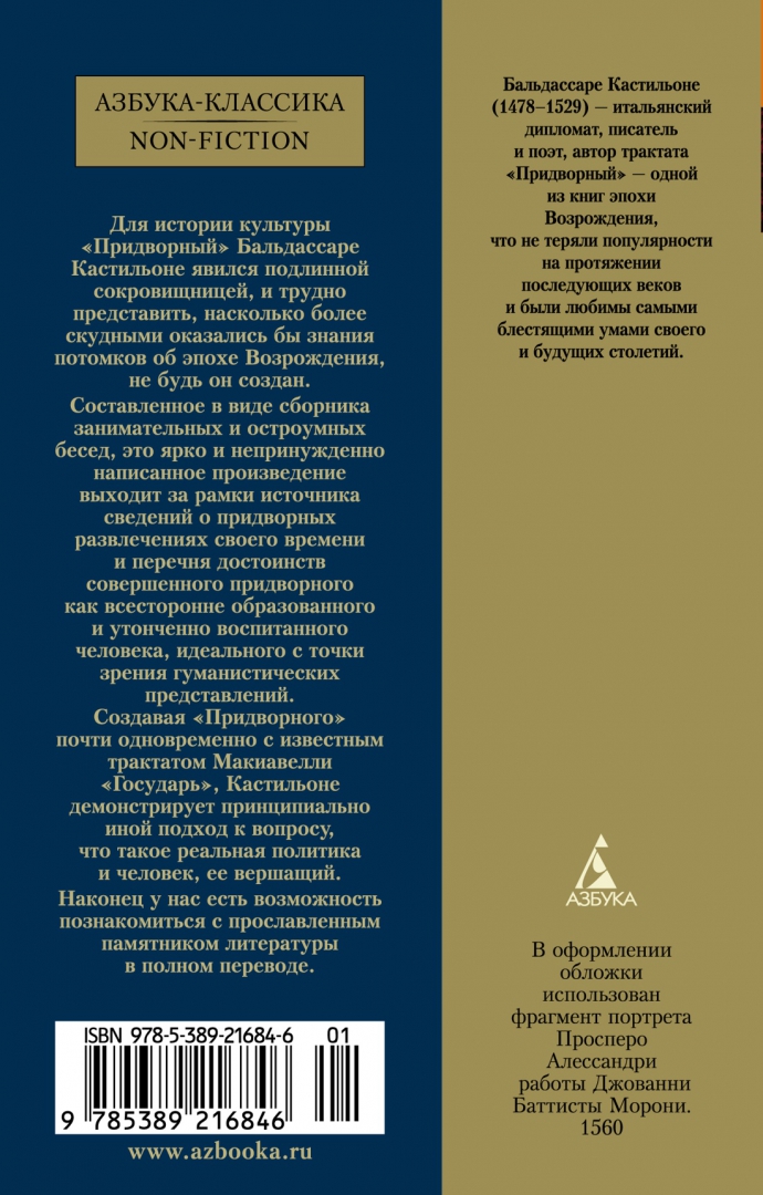 ОписаниеСочинение итальянского дипломата, писателя и поэта Бальдассаре Кастильоне (1478-1529) "Придворный", соединяющее воспоминания о придворной жизни герцогства Урбино в начале XVI века с размышлениями о морали, предназначении, стиле поведения дворянина, приближенного к государю, - одна из тех книг эпохи Возрождения, что не теряли популярности на протяжении последующих веков и были любимы самыми блестящими умами своего и будущих столетий. Для истории культуры труд Кастильоне явился подлинной сокровищницей, и трудно представить, насколько более скудными оказались бы знания потомков об эпохе Возрождения, не будь он создан. Составленное в виде сборника занимательных и остроумных бесед, это ярко и непринужденно написанное произведение выходит за рамки источника сведений о придворных развлечениях своего времени и перечня достоинств совершенного придворного как всесторонне образованного и утончённо воспитанного человека, идеального с точки зрения гуманистических представлений. Создавая "Придворного" почти одновременно с известным трактатом Макиавелли "Государь", Кастильоне демонстрирует принципиально иной подход к вопросу, что такое реальная политика и человек, ее вершащий. Как ни удивительно, за почти пятисотлетнюю историю этой знаменитой книги не было осуществлено ни одного полного ее перевода на русский язык, были опубликованы лишь отдельные фрагменты. И вот наконец у нас есть возможность познакомиться с прославленным памятником литературы в полном переводе.СвернутьСочинение итальянского дипломата, писателя и поэта Бальдассаре Кастильоне (1478-1529) "Придворный", соединяющее воспоминания о придворной жизни герцогства Урбино в начале XVI века с размышлениями о морали, предназначении, стиле поведения дворянина, приближенного к государю, - одна из тех книг эпохи Возрождения, что не теряли популярности на протяжении последующих веков и были любимы самыми блестящими умами своего и будущих столетий. Для истории культуры труд Кастильоне явился подлинной сокровищницей, и трудно представить, насколько более скудными оказались бы знания потомков об эпохе Возрождения, не будь он создан. Составленное в виде сборника занимательных и остроумных бесед, это ярко и непринужденно написанное произведение выходит за рамки источника сведений о придворных развлечениях своего времени и перечня достоинств совершенного придворного как всесторонне образованного и утончённо воспитанного человека, идеального с точки зрения гуманистических представлений. Создавая "Придворного" почти одновременно с известным трактатом Макиавелли "Государь", Кастильоне демонстрирует принципиально иной подход к вопросу, что такое реальная политика и человек, ее вершащий. Как ни удивительно, за почти пятисотлетнюю историю этой знаменитой книги не было осуществлено ни одного полного ее перевода на русский язык, были опубликованы лишь отдельные фрагменты. И вот наконец у нас есть возможность познакомиться с прославленным памятником литературы в полном переводе.СвернутьСвернуть