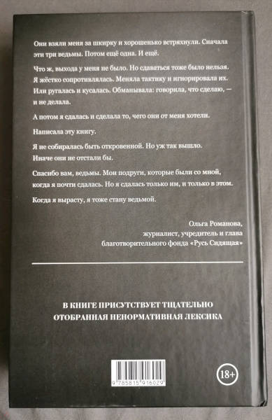 ОписаниеЭта книга - автобиография нашей современницы Ольги Романовой. Журналистка, дважды лауреат премии ТЭФИ, создатель и директор Благотворительного фонда помощи осужденным и их семьям «Русь Сидящая», лауреат премий имени Буцериуса (Гамбург), имени Гайдара (Москва), имени Сафо (Копенгаген), имени Артёма Боровика (Москва), премии Московской Хельсинкской группы и премии фонда «Либеральная миссия».Это то - что на поверхности, анкетные данные. Ну а жизнь, чувства, мысли? Эта книга – только о них. С детства до сегодняшнего дня Ольга Романова проживает перед нами свою жизнь, очищенную от шелухи анкет и расхожих мифов. Да не всё рассказано, и конечно, наверное, не всё объективно, как любая автобиография. Но предельно откровенно о том, о чем она решила рассказать нам, своим читателям и современникам.Они взяли меня за шкирку и хорошенько встряхнули. Сначала эти три ведьмы. Потом ещё одна. И ещё.Что ж, выхода у меня не было. Но сдаваться тоже было нельзя. Я жёстко сопротивлялась. Меняла тактику и игнорировала их. Или ругалась и кусалась. Обманывала: говорила, что сделаю, – и не делала.А потом я сдалась и сделала то, чего они от меня хотели.Написала эту книгу.Я не собиралась быть откровенной. Но уж так вышло. Иначе они не отстали бы.Спасибо вам, ведьмы. Мои подруги, которые были со мной, когда я почти сдалась. Но я сдалась только им, и только в этом.Когда я вырасту, я тоже стану ведьмой.Ольга РомановаСвернутьЭта книга - автобиография нашей современницы Ольги Романовой. Журналистка, дважды лауреат премии ТЭФИ, создатель и директор Благотворительного фонда помощи осужденным и их семьям «Русь Сидящая», лауреат премий имени Буцериуса (Гамбург), имени Гайдара (Москва), имени Сафо (Копенгаген), имени Артёма Боровика (Москва), премии Московской Хельсинкской группы и премии фонда «Либеральная миссия».Это то - что на поверхности, анкетные данные. Ну а жизнь, чувства, мысли? Эта книга – только о них. С детства до сегодняшнего дня Ольга Романова проживает перед нами свою жизнь, очищенную от шелухи анкет и расхожих мифов. Да не всё рассказано, и конечно, наверное, не всё объективно, как любая автобиография. Но предельно откровенно о том, о чем она решила рассказать нам, своим читателям и современникам.Они взяли меня за шкирку и хорошенько встряхнули. Сначала эти три ведьмы. Потом ещё одна. И ещё.Что ж, выхода у меня не было. Но сдаваться тоже было нельзя. Я жёстко сопротивлялась. Меняла тактику и игнорировала их. Или ругалась и кусалась. Обманывала: говорила, что сделаю, – и не делала.А потом я сдалась и сделала то, чего они от меня хотели.Написала эту книгу.Я не собиралась быть откровенной. Но уж так вышло. Иначе они не отстали бы.Спасибо вам, ведьмы. Мои подруги, которые были со мной, когда я почти сдалась. Но я сдалась только им, и только в этом.Когда я вырасту, я тоже стану ведьмой.Ольга РомановаСвернутьСвернуть