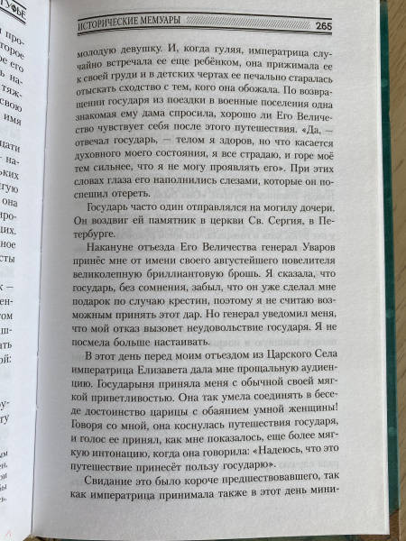 ОписаниеВоспоминания Софии Шуазёль-Гуфье — фрейлины императрицы Елизаветы Алексеевны, супруги Александра I и вдовствующей императрицы Марии Фёдоровны, живо рисуют нам ту атмосферу обожания, которую Александр I умел создавать около себя, искусно играя на людских сердцах. "Александр-прельститель" — так можно было бы озаглавить мемуары Шуазёль-Гуфье. Эта сторона личности Александра играла огромную роль в его жизни и в истории его правления, и вот почему мемуары графини, отразившие на себе эту черту, заслуживают внимания тех, кто интересуется русской историей.Воспоминания Софии Шуазёль-Гуфье — фрейлины императрицы Елизаветы Алексеевны, супруги Александра I и вдовствующей императрицы Марии Фёдоровны, живо рисуют нам ту атмосферу обожания, которую Александр I умел создавать около себя, искусно играя на людских сердцах. "Александр-прельститель" — так можно было бы озаглавить мемуары Шуазёль-Гуфье. Эта сторона личности Александра играла огромную роль в его жизни и в истории его правления, и вот почему мемуары графини, отразившие на себе эту черту, заслуживают внимания тех, кто интересуется русской историей.