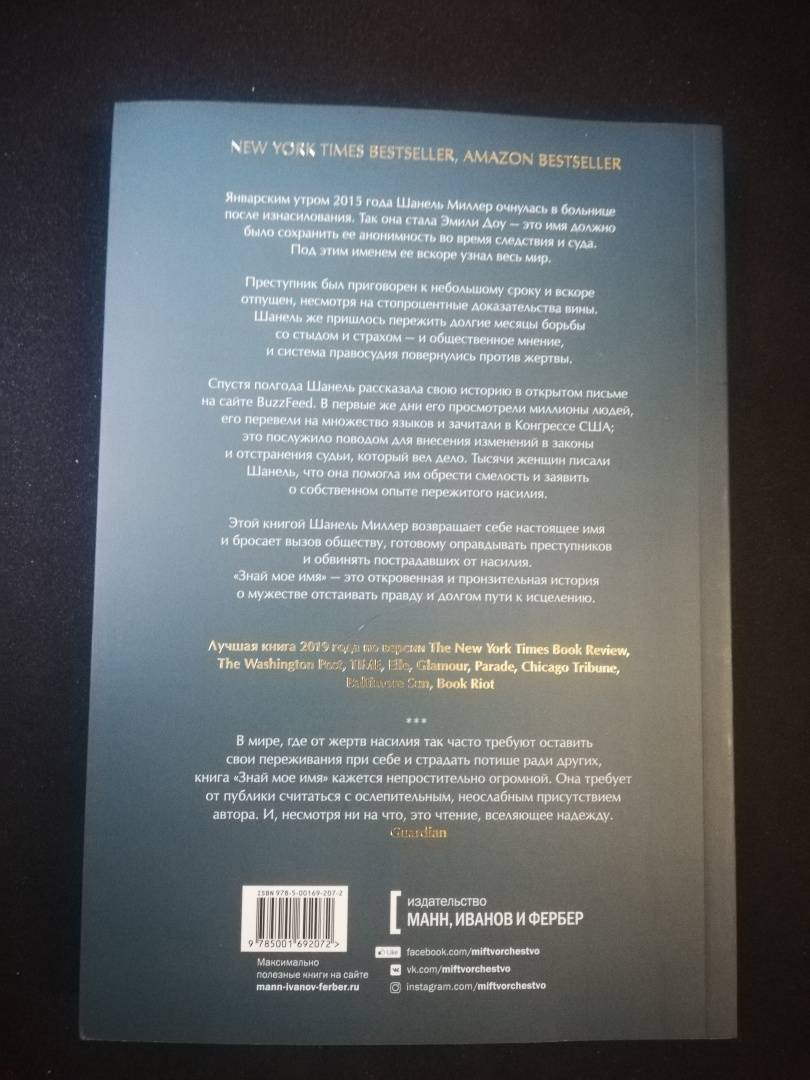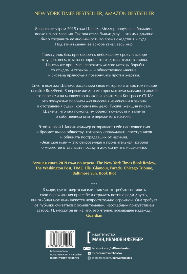 ОписаниеИстория о травме, преодолении и силе слова. Бестселлер New York Times, бестселлер Amazon, выбор читателей GR 2019.Она была известна миру как Эмили Доу, когда ошеломила миллионы людей своим "Заявлением жертвы". Брока Тернера, изнасиловавшего ее в кампусе Стэнфорда, приговорили к шести месяцам тюремного заключения. Открытое письмо Шанель было опубликовано на BuzzFeed, где оно сразу стало вирусным - за четыре дня его прочитали одиннадцать миллионов человек, оно было переведено на множество языков и зачитано в Конгрессе; это привело к изменениям в калифорнийском законодательстве и отзыву судьи, который вел дело Шанель. Glamour признал Эмили Доу женщиной года за то, что она "изменила ход дискуссии насчет сексуальных преступлений". Тысячи женщин сказали, что благодаря ей нашли в себе смелость впервые рассказать о насилии, которое пережили сами.Теперь она открывает лицо, чтобы поведать свою историю о травме, преодолении и силе слова. Дело Шанель казалось очень простым - были и свидетели, и вещественные доказательства, обвиняемый сбежал. Но история ее борьбы с изоляцией и стыдом во время следствия и суда показывает, с чем сталкиваются жертвы изнасилования даже в самых "удачных" случаях. Книга Шанель - обвинение системе, которая предпочитает защищать преступников и терзать пострадавших, и вместе с тем - яркий образец отваги, которая позволяет преодолеть любые испытания и вернуться к полноценной жизни."Знай мое имя" навсегда изменит наш взгляд на сексуальное насилие и представления о том, что приемлемо, а что нет. Это правдивый рассказ о тяжелом пути исцеления. И кроме того, это знакомство с новой выдающейся писательницей, чьи слова уже изменили наш мир. Эти мемуары, сочетающие в себе боль, стойкость и юмор, должны стать современной классикой.Признана лучшей книгой 2019 года по версиям New York Times Book Review, Washington Post, Npr, People, Parade, Time, Glamour, Chicago Tribune, Marie Claire, Elle, Fortune, Library Journal, Kirkus, Daily Mail, Baltimore Sun, She Reads, Man Repeller, Bookriot.Победитель премии Национального круга книжных критиков 2019 года в номинации "Автобиография".От автораВ январе 2015-го, когда я отправилась на вечеринку в Стэнфорд, мне было двадцать два года, я жила и работала в своем родном городе - Пало-Альто в Калифорнии. В тот день я подверглась сексуальному насилию; все произошло не в помещении, а на улице, прямо на земле. Двое случайных прохожих, увидев это, остановили его и спасли меня. Моей прежней жизни пришел конец, и потянулись совсем другие дни. Чтобы сохранить в тайне мою личность, мне дали новое имя. Я стала Эмили Доу.Иногда я буду называть адвоката защиты просто защитником, а судью всегда буду называть просто судьей. В моем повествовании они даны лишь для того, чтобы наглядно показать ту роль, которую каждый сыграл в этой истории. Я не собираюсь ни обвинять, ни очернять, ни злословить, ни мстить, ни переиначивать факты. Люди - существа вообще довольно многогранные. Было отвратительно, когда во время судебных заседаний на меня навешивали ярлыки, оговаривали и втаптывали меня в грязь, и я не поступлю подобным образом с теми, кто так делал. Я решила использовать его настоящее имя - Брок; но на самом деле он мог быть и Брэдом, и Броуди, и Бенсоном - не суть важно. Дело не в том, что из себя представляют как личности защитники, судьи и ответчики, а в том, насколько они вписаны в эту порочную систему и как поддерживают ее. Моя книга - 