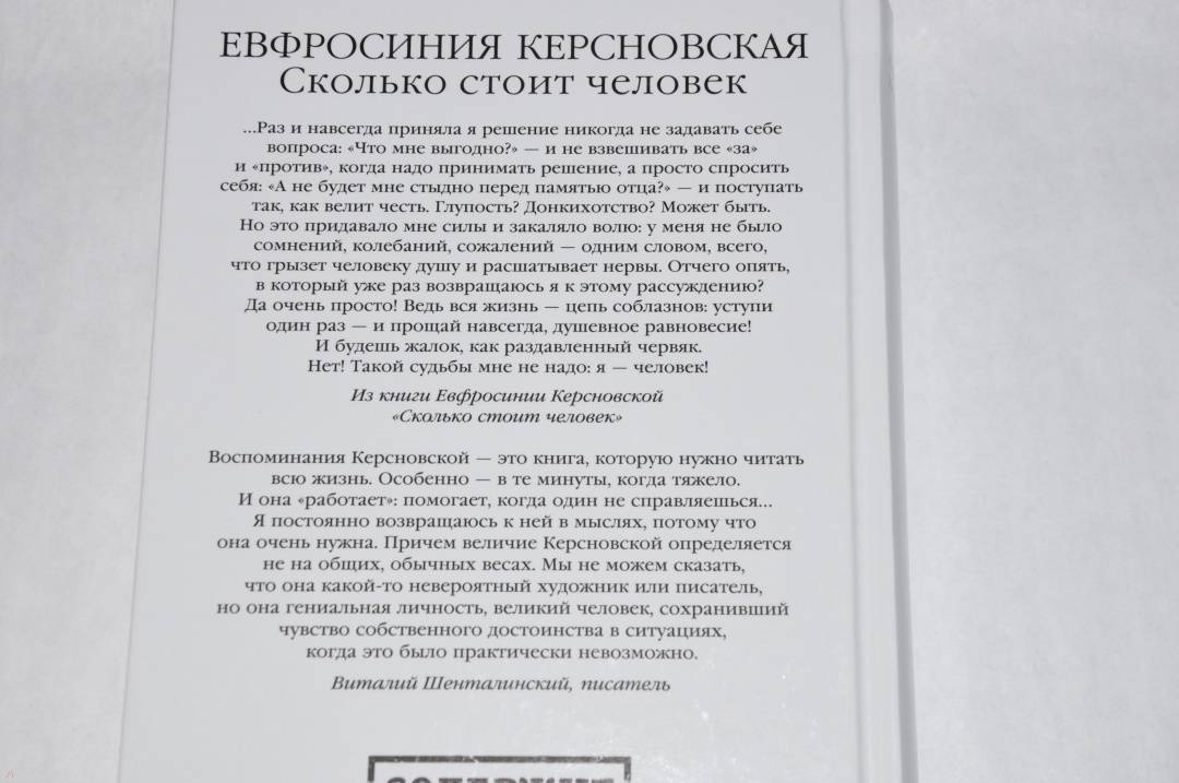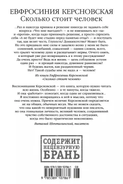 ОписаниеВоспоминания Евфросинии Керсновской (1907-1994) "Сколько стоит человек" - одна из самых удивительных мемуарных книг XX века. Это почти невероятная история о поединке с тоталитарным государством и о том, что из этого поединка можно выйти победителем. На долю Керсновской выпало 20 лет ссылок, тюрем, лагерей, но лишения и тяжкие испытания ее не сломили. В книге повествуется о силе и бессилии, о страданиях и унижениях, об отчаянии, о смерти и крови. Но закрываешь ее с ощущением света и веры в то, что человек во всех обстоятельствах может оставаться человеком - и "ни единой долькой не отступаться от лица, но быть живым, живым и только, живым и только до конца". Издание содержит цветную вклейку с 32 авторскими рисунками, созданными как иллюстрации к книге воспоминаний, а также статью "Об авторе", в которой рассказывается о судьбе Керсновской и истории написания книги.Воспоминания Евфросинии Керсновской (1907-1994) "Сколько стоит человек" - одна из самых удивительных мемуарных книг XX века. Это почти невероятная история о поединке с тоталитарным государством и о том, что из этого поединка можно выйти победителем. На долю Керсновской выпало 20 лет ссылок, тюрем, лагерей, но лишения и тяжкие испытания ее не сломили. В книге повествуется о силе и бессилии, о страданиях и унижениях, об отчаянии, о смерти и крови. Но закрываешь ее с ощущением света и веры в то, что человек во всех обстоятельствах может оставаться человеком - и "ни единой долькой не отступаться от лица, но быть живым, живым и только, живым и только до конца". Издание содержит цветную вклейку с 32 авторскими рисунками, созданными как иллюстрации к книге воспоминаний, а также статью "Об авторе", в которой рассказывается о судьбе Керсновской и истории написания книги.