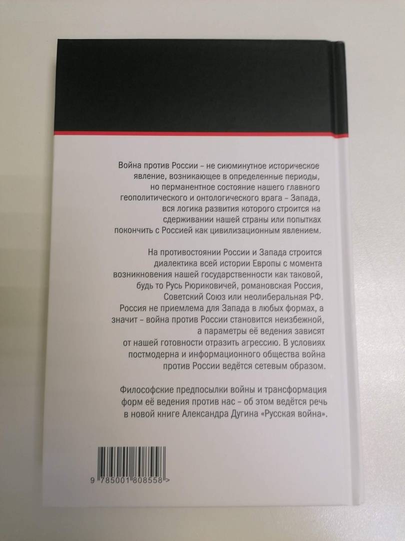 ОписаниеВойна против России - не сиюминутное историческое явление, возникающее в определенные периоды, но перманентное состояние нашего главного геополитического и онтологического врага - Запада, вся логика развития которого строится на сдерживании нашей страны или попытках покончить с Россией как цивилизационным явлением. На противостоянии России и Запада строится диалектика всей истории Европы с момента возникновения нашей государственности как таковой, будь то Русь Рюриковичей, романовская Россия, Советский Союз или неолиберальная РФ. Россия не приемлема для Запада в любых формах, а значит - война против России становится неизбежной, а параметры её ведения зависят от нашей готовности отразить агрессию. В условиях постмодерна и информационного общества война против России ведётся сетевым образом. Философские предпосылки войны и трансформация форм её ведения против нас - об этом ведётся речь в новой книге Александра Дугина "Русская война".Война против России - не сиюминутное историческое явление, возникающее в определенные периоды, но перманентное состояние нашего главного геополитического и онтологического врага - Запада, вся логика развития которого строится на сдерживании нашей страны или попытках покончить с Россией как цивилизационным явлением. На противостоянии России и Запада строится диалектика всей истории Европы с момента возникновения нашей государственности как таковой, будь то Русь Рюриковичей, романовская Россия, Советский Союз или неолиберальная РФ. Россия не приемлема для Запада в любых формах, а значит - война против России становится неизбежной, а параметры её ведения зависят от нашей готовности отразить агрессию. В условиях постмодерна и информационного общества война против России ведётся сетевым образом. Философские предпосылки войны и трансформация форм её ведения против нас - об этом ведётся речь в новой книге Александра Дугина "Русская война".