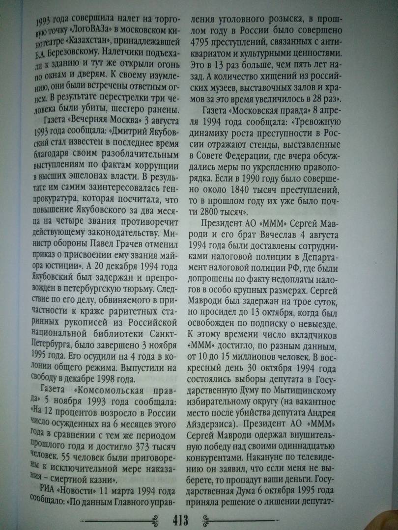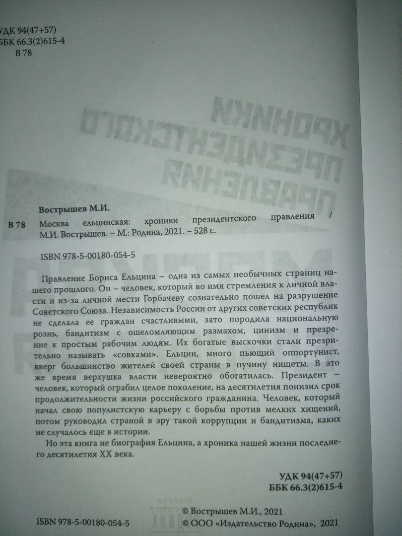 ОписаниеПравление Бориса Ельцина - одна из самых необычных страниц нашего прошлого. Он - человек, который во имя стремления к личной власти и из-за личной мести Горбачеву сознательно пошел на разрушение Советского Союза. Независимость России от других советских республик не сделала ее граждан счастливыми, зато породила национальную рознь, бандитизм с ошеломляющим размахом, цинизм и презрение к простым рабочим людям. Их богатые выскочки стали презрительно называть "совками". Ельцин, много пьющий оппортунист, вверг большинство жителей своей страны в пучину нищеты. В это же время верхушка власти невероятно обогатилась. Президент - человек, который ограбил целое поколение, на десятилетия понизил срок продолжительности жизни российского гражданина. Человек, который начал свою популистскую карьеру с борьбы против мелких хищений, потом руководил страной в эру такой коррупции и бандитизма, каких не случалось еще в истории. Но эта книга не биография Ельцина, а хроника нашей жизни последнего десятилетия XX века.СвернутьПравление Бориса Ельцина - одна из самых необычных страниц нашего прошлого. Он - человек, который во имя стремления к личной власти и из-за личной мести Горбачеву сознательно пошел на разрушение Советского Союза. Независимость России от других советских республик не сделала ее граждан счастливыми, зато породила национальную рознь, бандитизм с ошеломляющим размахом, цинизм и презрение к простым рабочим людям. Их богатые выскочки стали презрительно называть "совками". Ельцин, много пьющий оппортунист, вверг большинство жителей своей страны в пучину нищеты. В это же время верхушка власти невероятно обогатилась. Президент - человек, который ограбил целое поколение, на десятилетия понизил срок продолжительности жизни российского гражданина. Человек, который начал свою популистскую карьеру с борьбы против мелких хищений, потом руководил страной в эру такой коррупции и бандитизма, каких не случалось еще в истории. Но эта книга не биография Ельцина, а хроника нашей жизни последнего десятилетия XX века.СвернутьСвернуть
