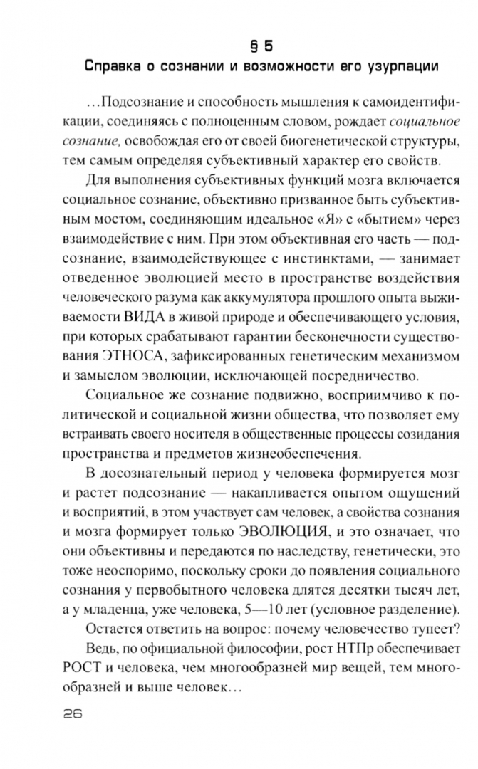 ОписаниеКнига является хрестоматийным изданием предыдущих трех разделов книги "Правда философии для человека…", в которой автор, подводя итоги, делает главные выводы своей аналитической работы над западной философией, раскрывая её лженаучные аспекты, касающиеся природы, общества и человека. Автор вскрывает основные причины дисгармонии мира, которые человечество интуитивно пытается понять две с половиной тысячи лет. Дать этот ответ позволила Русская сторона диалектики, возникшая в результате открытия недостающего науке объективного закона развития, лежащего в основе бытия и биологической жизни на Земле в частности. Закону зависимой востребованности подчинены как бесконечность пространства и времени, так и жизнь прорастающего зерна ржи, также зависящей от земли, воды и солнца. Прочитав книгу, читатель воочию убедится, что и процессы развития примата человека и его сознания также подчинены действию названного закона - общинность от развития инстинктов, памяти от языка и что сознание - это не особая форма материи, а фактор востребованности знания. Сделать публичное сообщение об открытии мешает политическая власть и бесчестная часть науки, вершины знаний и жизненного благополучия которых покоятся на лжи, потому также находятся в прямой зависимости от сделанных открытий, изобличающих Запад.СвернутьКнига является хрестоматийным изданием предыдущих трех разделов книги "Правда философии для человека…", в которой автор, подводя итоги, делает главные выводы своей аналитической работы над западной философией, раскрывая её лженаучные аспекты, касающиеся природы, общества и человека. Автор вскрывает основные причины дисгармонии мира, которые человечество интуитивно пытается понять две с половиной тысячи лет. Дать этот ответ позволила Русская сторона диалектики, возникшая в результате открытия недостающего науке объективного закона развития, лежащего в основе бытия и биологической жизни на Земле в частности. Закону зависимой востребованности подчинены как бесконечность пространства и времени, так и жизнь прорастающего зерна ржи, также зависящей от земли, воды и солнца. Прочитав книгу, читатель воочию убедится, что и процессы развития примата человека и его сознания также подчинены действию названного закона - общинность от развития инстинктов, памяти от языка и что сознание - это не особая форма материи, а фактор востребованности знания. Сделать публичное сообщение об открытии мешает политическая власть и бесчестная часть науки, вершины знаний и жизненного благополучия которых покоятся на лжи, потому также находятся в прямой зависимости от сделанных открытий, изобличающих Запад.СвернутьСвернуть