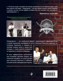 ОписаниеПечатная версия музыкального проекта "Квартирник у Маргулиса". "Квартирник" — это необычный формат, подкупающий неформальностью и живой творческой атмосферой. В гости к Евгению Маргулису приходят популярные музыканты и камерно исполняют лучшие песни и новые композиции, а также делятся историями из прошлого и планами на будущее. И если неформальное музыкальное шоу позволяет зрителям увидеть акустические концерты, то книга раскрывает читателю известных и любимых исполнителей с неожиданной стороны.В книгу вошли встречи с такими группами и музыкантами как "Крематорий", "Сплин", "Браво", "Аквариум", "Манго-манго", Гарик Сукачев, Олег Митяев, Алена Свиридова, Горан Брегович и многими другими.Печатная версия музыкального проекта "Квартирник у Маргулиса". "Квартирник" — это необычный формат, подкупающий неформальностью и живой творческой атмосферой. В гости к Евгению Маргулису приходят популярные музыканты и камерно исполняют лучшие песни и новые композиции, а также делятся историями из прошлого и планами на будущее. И если неформальное музыкальное шоу позволяет зрителям увидеть акустические концерты, то книга раскрывает читателю известных и любимых исполнителей с неожиданной стороны.В книгу вошли встречи с такими группами и музыкантами как "Крематорий", "Сплин", "Браво", "Аквариум", "Манго-манго", Гарик Сукачев, Олег Митяев, Алена Свиридова, Горан Брегович и многими другими.