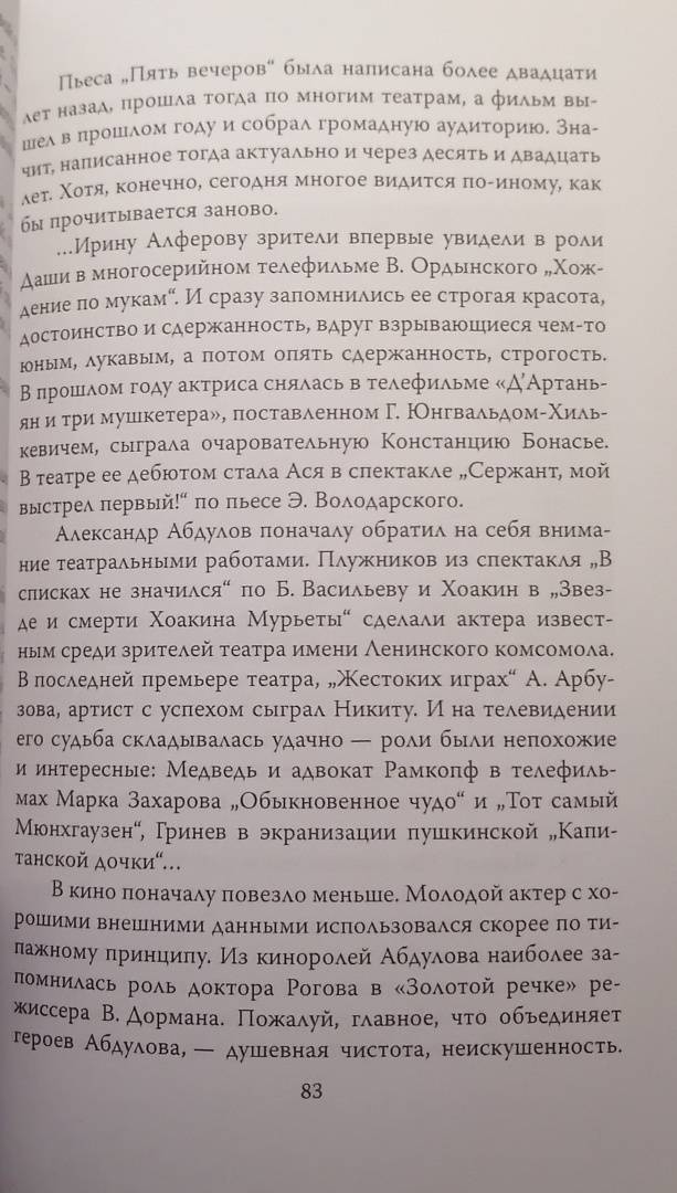 Описание"Ира Алферова - глубоко славянский тип. И французская легкость ей не свойственна", - утверждал режиссер Георгий Юнгвальд-Хилькевич, не желавший снимать актрису в роли Констанции в "Трёх мушкетерах". Но для многих поколений советских зрителей красавица-актриса так и осталась трогательной, милой и беззащитной Констанцией. Хотя на ее долю выпали гораздо более глубокие и сложные роли - и в кино, и в жизни. Сложно сказать какая из них была основной, самой важной: роль матери, роль возлюбленной или роль актрисы, известной нам по фильмам ("Хождение по мукам", "Предчувствие любви", "ТАСС уполномочен заявить…" и др.), и ленкомовским спектаклям. Она любила и была любима, ей хватило удивительного женского таланта и истинно славянской щедрости, чтобы принять в семью и воспитать троих приемных детей: двоих детей последнего мужа - Анастасию и Сергея, и Александра, сына своей сестры Татьяны, умершей в 1997-м. А вечная фраза "С любимыми не расставайтесь" осталась в наших сердцах благодаря одноименной мелодраме, в которой главную мужскую роль сыграл самый красивый актер страны - Абдулов, а главную женскую роль его супруга - Ирина Алферова.Свернуть"Ира Алферова - глубоко славянский тип. И французская легкость ей не свойственна", - утверждал режиссер Георгий Юнгвальд-Хилькевич, не желавший снимать актрису в роли Констанции в "Трёх мушкетерах". Но для многих поколений советских зрителей красавица-актриса так и осталась трогательной, милой и беззащитной Констанцией. Хотя на ее долю выпали гораздо более глубокие и сложные роли - и в кино, и в жизни. Сложно сказать какая из них была основной, самой важной: роль матери, роль возлюбленной или роль актрисы, известной нам по фильмам ("Хождение по мукам", "Предчувствие любви", "ТАСС уполномочен заявить…" и др.), и ленкомовским спектаклям. Она любила и была любима, ей хватило удивительного женского таланта и истинно славянской щедрости, чтобы принять в семью и воспитать троих приемных детей: двоих детей последнего мужа - Анастасию и Сергея, и Александра, сына своей сестры Татьяны, умершей в 1997-м. А вечная фраза "С любимыми не расставайтесь" осталась в наших сердцах благодаря одноименной мелодраме, в которой главную мужскую роль сыграл самый красивый актер страны - Абдулов, а главную женскую роль его супруга - Ирина Алферова.СвернутьСвернуть