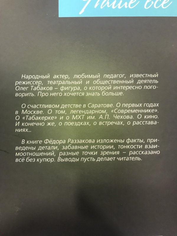 ОписаниеНародный актер, любимый педагог, известный режиссер, театральный и общественный деятель Олег Табаков - фигура, о которой интересно поговорить. Про него хочется знать больше.О счастливом детстве в Саратове. О первых годах в Москве. О том, легендарном, "Современнике". О "Табакерке" и о МХТ им. А.П. Чехова. О кино. И конечно же, о поездках, о встречах, о расставаниях...В книге Федора Раззакова изложены факты, приведены детали, забавные истории, тонкости взаимоотношений, разные точки зрения - рассказано всё без купюр. Выводы пусть делает читатель.Народный актер, любимый педагог, известный режиссер, театральный и общественный деятель Олег Табаков - фигура, о которой интересно поговорить. Про него хочется знать больше.О счастливом детстве в Саратове. О первых годах в Москве. О том, легендарном, "Современнике". О "Табакерке" и о МХТ им. А.П. Чехова. О кино. И конечно же, о поездках, о встречах, о расставаниях...В книге Федора Раззакова изложены факты, приведены детали, забавные истории, тонкости взаимоотношений, разные точки зрения - рассказано всё без купюр. Выводы пусть делает читатель.