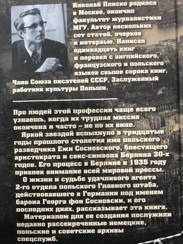 ОписаниеПро людей этой профессии чаще всего узнаешь, когда их трудная миссия окончена и часто - не по их вине. Яркой звездой вспыхнуло в тридцатые годы прошлого столетия имя польского разведчика Ежи Сосновского, блестящего аристократа и секс-символа Берлина 30-х годов. Его процесс в Берлине в 1935 году привлек внимание всей мировой прессы. О жизни и судьбе удачливого агента 2-го отдела польского Главного штаба, действовавшего в Германии под именем барона Георга фон Сосновски, и его последних днях, рассказывает эта книга. Материалом для ее создания послужили недавно рассекреченные немецкие, польские и советские архивы спецслужб.Про людей этой профессии чаще всего узнаешь, когда их трудная миссия окончена и часто - не по их вине. Яркой звездой вспыхнуло в тридцатые годы прошлого столетия имя польского разведчика Ежи Сосновского, блестящего аристократа и секс-символа Берлина 30-х годов. Его процесс в Берлине в 1935 году привлек внимание всей мировой прессы. О жизни и судьбе удачливого агента 2-го отдела польского Главного штаба, действовавшего в Германии под именем барона Георга фон Сосновски, и его последних днях, рассказывает эта книга. Материалом для ее создания послужили недавно рассекреченные немецкие, польские и советские архивы спецслужб.
