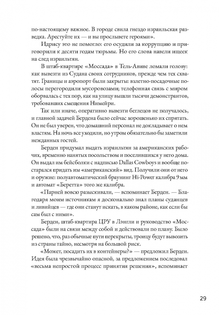 ОписаниеВ начале 1980-х годов на суданском побережье Красного моря открылся дайвинг-курорт, организованный некими европейскими бизнесменами при полном одобрении и поддержке суданских властей. И ни чиновникам, ни гостям курорта было невдомек, что поселок - база тайных агентов "Моссада", израильской спецслужбы. Днем тут развлекали туристов, а под покровом ночи отправляли сотни эфиопских евреев в Израиль. Курорт Арус стал частью широкомасштабной операции с участием ВМФ и ВВС Израиля. Постоянно рискуя свободой и жизнью, агенты действовали под носом у суданской полиции, армии и бдительных граждан. Но задача переправить "потерянное колено" была важнее, чем риск. Британский журналист Раффи Берг провел огромную работу, чтобы установить подробности этой невероятной истории, долгое время запечатанной грифом "секретно". В этом ему помогали сами участники событий. Его книга - одновременно захватывающий детектив, приключенческий роман и политический триллер.В начале 1980-х годов на суданском побережье Красного моря открылся дайвинг-курорт, организованный некими европейскими бизнесменами при полном одобрении и поддержке суданских властей. И ни чиновникам, ни гостям курорта было невдомек, что поселок - база тайных агентов "Моссада", израильской спецслужбы. Днем тут развлекали туристов, а под покровом ночи отправляли сотни эфиопских евреев в Израиль. Курорт Арус стал частью широкомасштабной операции с участием ВМФ и ВВС Израиля. Постоянно рискуя свободой и жизнью, агенты действовали под носом у суданской полиции, армии и бдительных граждан. Но задача переправить "потерянное колено" была важнее, чем риск. Британский журналист Раффи Берг провел огромную работу, чтобы установить подробности этой невероятной истории, долгое время запечатанной грифом "секретно". В этом ему помогали сами участники событий. Его книга - одновременно захватывающий детектив, приключенческий роман и политический триллер.