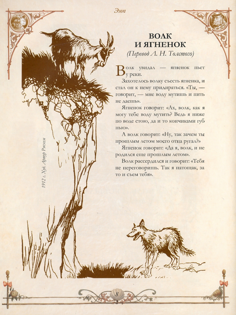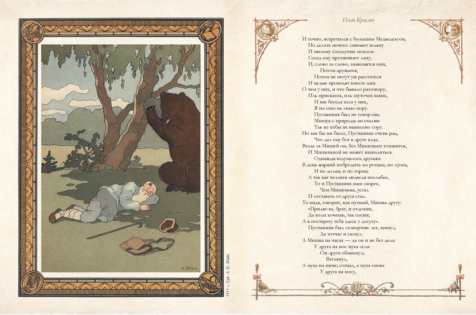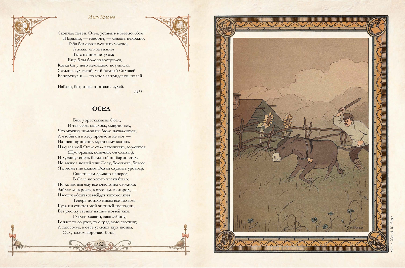 Описание"...Мир, который находим мы в басне, есть некоторым образом чистое зеркало, в котором отражается мир человеческий", - так в начале XIX века охарактеризовал басню Василий Жуковский.Басня доставляет необыкновенное удовольствие читателям любого возраста. Не удивительно, ведь она восходит к чудесным сказаниям первобытных времен, необычайно популярным в культурах самых разных народов.Величайшим баснописцем древности был грек Эзоп (ок. 600-х гг. до н. э). От греков басни перешли к народам Европы и Азии, переводились и переделывались на всех языках, пока в России этот жанр не довел до гениального совершенства Иван Крылов (1769-1844). Мораль, получающая сквозь басню привлекательный характер, - таково главное свойство этого "чистого зеркала", помогающее человеку присмотреться к своим несовершенствам.Составитель: В.В. Кузьмин."...Мир, который находим мы в басне, есть некоторым образом чистое зеркало, в котором отражается мир человеческий", - так в начале XIX века охарактеризовал басню Василий Жуковский.Басня доставляет необыкновенное удовольствие читателям любого возраста. Не удивительно, ведь она восходит к чудесным сказаниям первобытных времен, необычайно популярным в культурах самых разных народов.Величайшим баснописцем древности был грек Эзоп (ок. 600-х гг. до н. э). От греков басни перешли к народам Европы и Азии, переводились и переделывались на всех языках, пока в России этот жанр не довел до гениального совершенства Иван Крылов (1769-1844). Мораль, получающая сквозь басню привлекательный характер, - таково главное свойство этого "чистого зеркала", помогающее человеку присмотреться к своим несовершенствам.Составитель: В.В. Кузьмин.