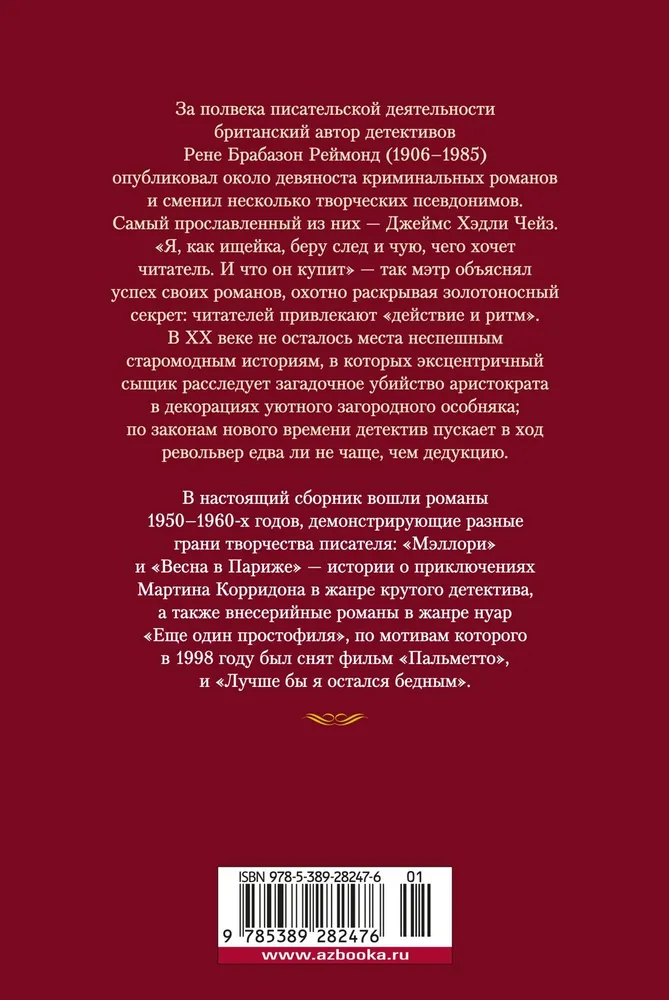ОписаниеАннотация к книге "Лучше бы я остался бедным" Чейз Дж. Х.:За полвека писательской деятельности британский автор детективов Рене Брабазон Реймонд (1906–1985) опубликовал около девяноста криминальных романов и сменил несколько творческих псевдонимов. Самый прославленный из них — Джеймс Хэдли Чейз. «Я, как ищейка, беру след и чую, чего хочет читатель. И что он купит» — так мэтр объяснял успех своих романов, охотно раскрывая золотоносный секрет: читателей привлекают «действие и ритм». В XX веке не осталось места неспешным старомодным историям, в которых эксцентричный сыщик расследует загадочное убийство аристократа в декорациях уютного загородного особняка; по законам нового времени детектив пускает в ход револьвер едва ли не чаще, чем дедукцию. В настоящий сборник вошли романы 1950–1960-х годов, демонстрирующие разные грани творчества писателя: «Мэллори» и «Весна в Париже» — истории о приключениях Мартина Корридона в жанре крутого детектива, а также внесерийные романы в жанре нуар «Еще один простофиля», по мотивам которого в 1998 году был снят фильм «Пальметто», и «Лучше бы я остался бедным». Читать дальше…