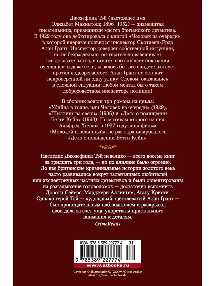 ОписаниеДжозефина Тэй (наст. имя Элизабет Макинтош; 1896–1952) — знаменитая писательница, дочь шотландца и англичанки, признанный мастер британского детектива. В 1929 году она дебютировала с книгой «Человек из очереди», в которой впервые появился инспектор Скотленд-Ярда Алан Грант (впоследствии герой еще пяти ее романов). Инспектор доверяет собственной интуиции, но не безраздельно: он тщательно взвешивает все доказательства, внимательно слушает показания очевидцев; и даже если, казалось бы, все свидетельствует против подозреваемого, Алан Грант не оставит непроверенной ни одну улику. Словом, оказавшись в сложной ситуации, любой мечтал бы о таком добросовестном инспекторе полиции! В сборник вошли три романа из цикла: «Убийца в толпе, или Человек из очереди» (1929), «Шиллинг на свечи» (1936) и «Дело о похищении Бетти Кейн» (1948). По мотивам второго из них Альфред Хичкок в 1937 году снял фильм «Молодой и невинный», по роману «Дело о похищении Бетти Кейн» созданы киноверсии 1951 и 1962 годов (под названием «The Franchise Affair») и телевизионный сериал 1988 года.
