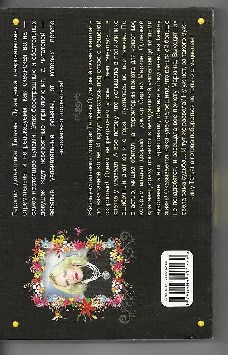 ОписаниеЖизнь учительницы истории Татьяны Одинцовой скучно катилась по накатанной колее. И вдруг понеслась под откос с бешеной скоростью! Одним непрекрасным утром Таня очнулась… в клетке у медведя! А все потому, что услышала в поликлинике ошибочный диагноз и с горя пустилась во все тяжкие. По счастью, мишка обитал на территории приюта для животных, которым владел добрый доктор Сергей Маркин. Одинокий красавец сразу проникся к незадачливой учительнице теплыми чувствами, а его… арестовали, обвинив в покушении на Танину жизнь! Оказывается, накануне она решила, что деньги ей больше не понадобятся, и завещала все приюту Маркина. Выходит, их свела сама судьба… И тут же развела? Ну уж нет, за такого мужчину Татьяна готова побороться не только с медведем!Жизнь учительницы истории Татьяны Одинцовой скучно катилась по накатанной колее. И вдруг понеслась под откос с бешеной скоростью! Одним непрекрасным утром Таня очнулась… в клетке у медведя! А все потому, что услышала в поликлинике ошибочный диагноз и с горя пустилась во все тяжкие. По счастью, мишка обитал на территории приюта для животных, которым владел добрый доктор Сергей Маркин. Одинокий красавец сразу проникся к незадачливой учительнице теплыми чувствами, а его… арестовали, обвинив в покушении на Танину жизнь! Оказывается, накануне она решила, что деньги ей больше не понадобятся, и завещала все приюту Маркина. Выходит, их свела сама судьба… И тут же развела? Ну уж нет, за такого мужчину Татьяна готова побороться не только с медведем!