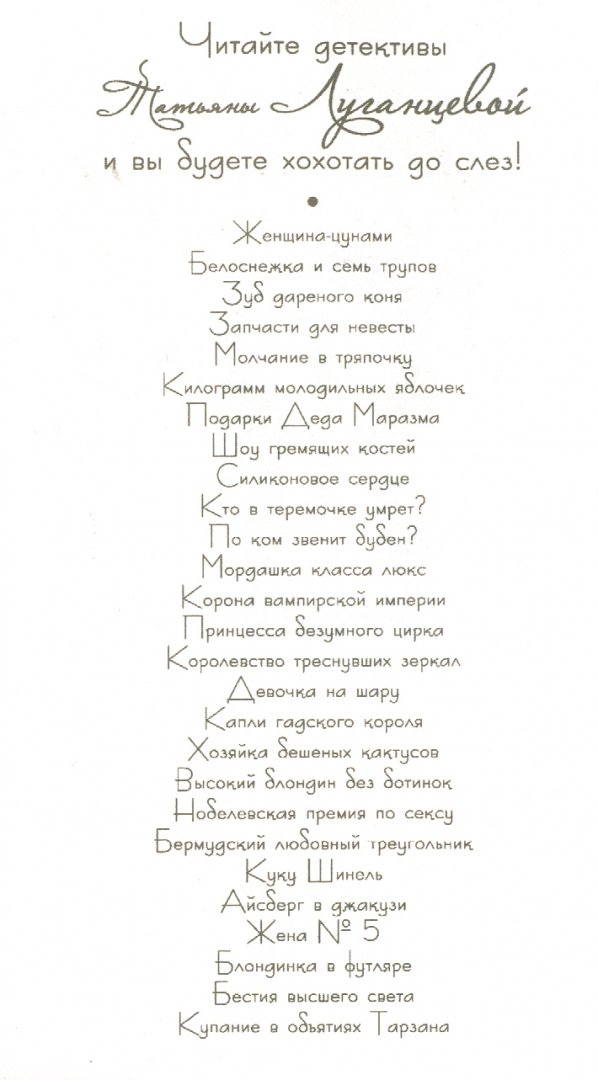 ---Татьяна Луганцева: Где заключаются браки?Русская классическая и современная литератураДетектив. Остросюжетная литератураЗарубежная художественная литератураРусская художественная литератураФэнтезиДраматургияПоэзияПриключенияФантастикаЭпос и фольклорКлассическая прозаАфоризмыИсторическая прозаДетективыБасниСентиментальная прозаОтечественный боевикСовременная прозаМолодежная литератураЗарубежная классическая и современная литература
