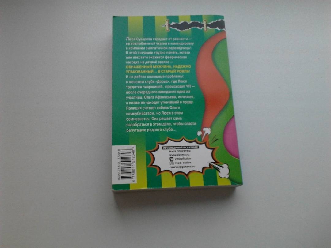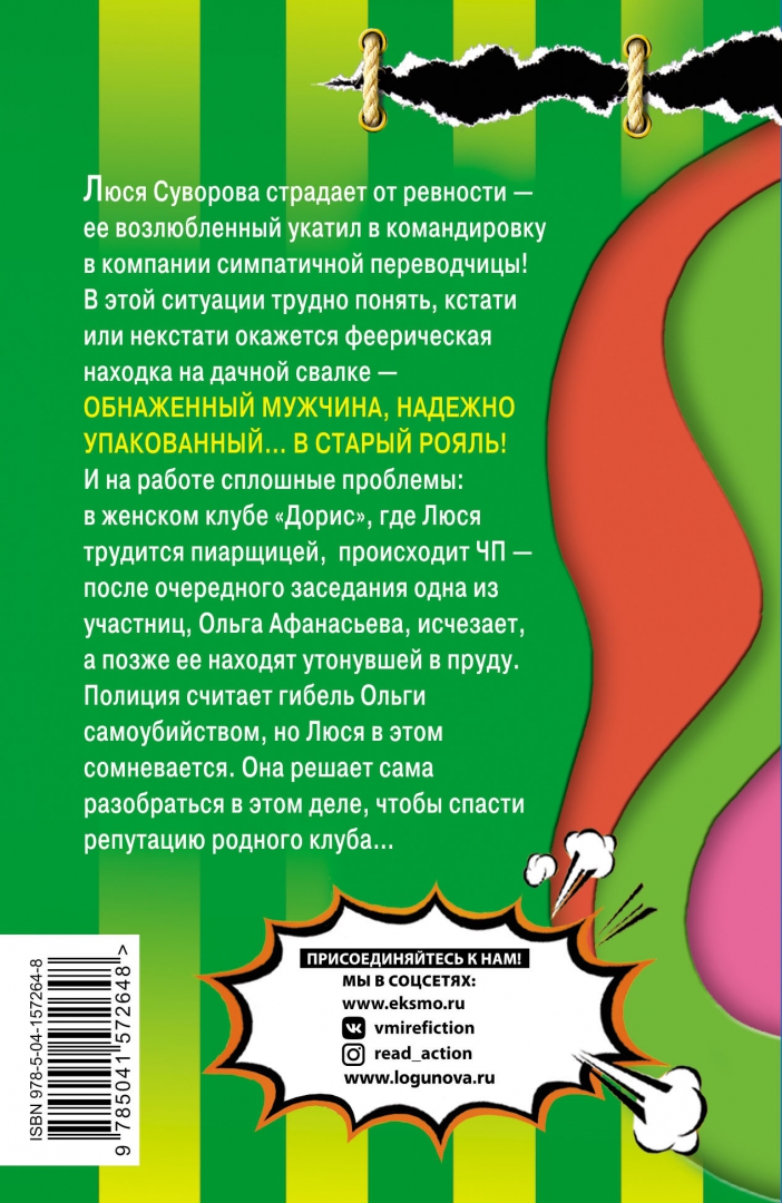 ОписаниеЛюся Суворова страдает от ревности - ее возлюбленный укатил в командировку в компании симпатичной переводчицы! В этой ситуации трудно понять, кстати или некстати окажется феерическая находка на дачной свалке - обнаженный мужчина, надежно упакованный… в старый рояль! И на работе сплошные проблемы: в женском клубе "Дорис", где Люся трудится пиарщицей, происходит ЧП - после очередного заседания одна из участниц, Ольга Афанасьева, исчезает, а позже ее находят утонувшей в пруду. Полиция считает гибель Ольги самоубийством, но Люся в этом сомневается. Она решает сама разобраться в этом деле, чтобы спасти репутацию родного клуба… Смешные детективы Елены Логуновой - это увлекательные интриги, веселые приключения и блестящий авторский юмор. Ее героини легко и изящно распутывают хитроумные преступления, всегда оставаясь самыми обаятельными и привлекательными!Люся Суворова страдает от ревности - ее возлюбленный укатил в командировку в компании симпатичной переводчицы! В этой ситуации трудно понять, кстати или некстати окажется феерическая находка на дачной свалке - обнаженный мужчина, надежно упакованный… в старый рояль! И на работе сплошные проблемы: в женском клубе "Дорис", где Люся трудится пиарщицей, происходит ЧП - после очередного заседания одна из участниц, Ольга Афанасьева, исчезает, а позже ее находят утонувшей в пруду. Полиция считает гибель Ольги самоубийством, но Люся в этом сомневается. Она решает сама разобраться в этом деле, чтобы спасти репутацию родного клуба… Смешные детективы Елены Логуновой - это увлекательные интриги, веселые приключения и блестящий авторский юмор. Ее героини легко и изящно распутывают хитроумные преступления, всегда оставаясь самыми обаятельными и привлекательными!