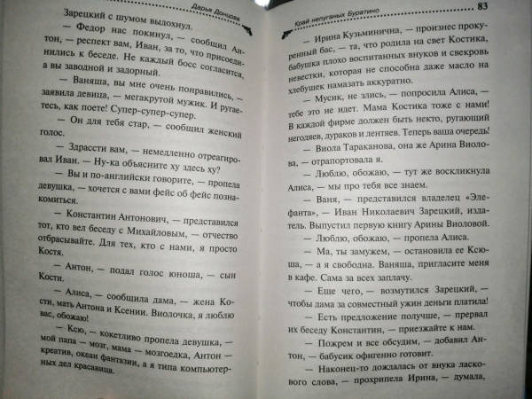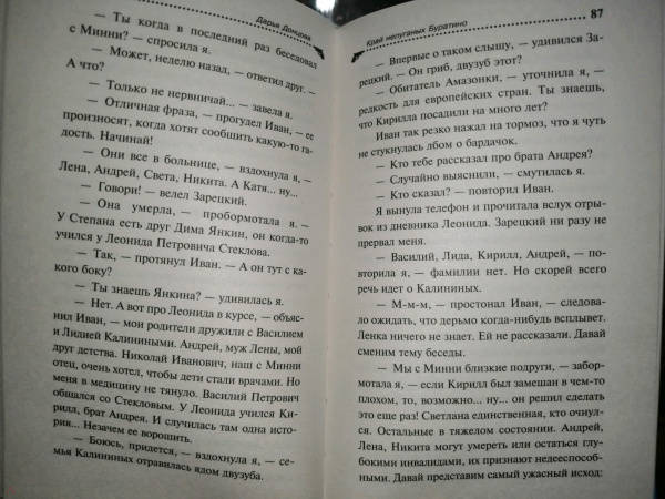 ОписаниеКрасота спасет мир, но погубит ваш кошелёк. Виола Тараканова узнала, сколько денег хочет за свои услуги салон красоты, и рассердилась. Именно в эту минуту ей позвонила подруга Елена Калинина и сообщила о внезапной кончине своей домработницы Екатерины. Вилка помчалась к подруге и оказалась в клубке самых неприятных событий, ведь вслед за Катей в больницу отвезли почти всю семью Калининых! Виола и ее муж Степан выяснили, что все домочадцы отравились ядом редкого животного - амазонского двузуба. Отрава была в блюде из морепродуктов, которым семья ужинала накануне. Вся семья, кроме дяди Кирилла… Конечно, он первый подозреваемый, учитывая его криминальное прошлое. Однако даже видавшая виды Вилка была поражена в самое сердце, когда узнала, кто на самом деле злодей-отравитель! Дарья Донцова - самый популярный и востребованный автор в нашей стране, любимица миллионов читателей. В России продано более 200 миллионов экземпляров ее книг. Ее творчество наполняет сердца и души светом, оптимизмом, радостью, уверенностью в завтрашнем дне! "Донцова невероятная работяга! Я не знаю ни одного другого писателя, который столько работал бы. Я отношусь к ней с уважением, как к образцу писательского трудолюбия. Женщины нуждаются в психологической поддержке и получают ее от Донцовой. Я и сама в свое время прочла несколько романов Донцовой. Ее читают очень разные люди. И очень занятые бизнес-леди, чтобы на время выключить голову, и домохозяйки, у которых есть перерыв 15-20 минут между отвести-забрать детей". - Галина Юзефович, литературный критикСвернутьКрасота спасет мир, но погубит ваш кошелёк. Виола Тараканова узнала, сколько денег хочет за свои услуги салон красоты, и рассердилась. Именно в эту минуту ей позвонила подруга Елена Калинина и сообщила о внезапной кончине своей домработницы Екатерины. Вилка помчалась к подруге и оказалась в клубке самых неприятных событий, ведь вслед за Катей в больницу отвезли почти всю семью Калининых! Виола и ее муж Степан выяснили, что все домочадцы отравились ядом редкого животного - амазонского двузуба. Отрава была в блюде из морепродуктов, которым семья ужинала накануне. Вся семья, кроме дяди Кирилла… Конечно, он первый подозреваемый, учитывая его криминальное прошлое. Однако даже видавшая виды Вилка была поражена в самое сердце, когда узнала, кто на самом деле злодей-отравитель! Дарья Донцова - самый популярный и востребованный автор в нашей стране, любимица миллионов читателей. В России продано более 200 миллионов экземпляров ее книг. Ее творчество наполняет сердца и души светом, оптимизмом, радостью, уверенностью в завтрашнем дне! "Донцова невероятная работяга! Я не знаю ни одного другого писателя, который столько работал бы. Я отношусь к ней с уважением, как к образцу писательского трудолюбия. Женщины нуждаются в психологической поддержке и получают ее от Донцовой. Я и сама в свое время прочла несколько романов Донцовой. Ее читают очень разные люди. И очень занятые бизнес-леди, чтобы на время выключить голову, и домохозяйки, у которых есть перерыв 15-20 минут между отвести-забрать детей". - Галина Юзефович, литературный критикСвернутьСвернуть