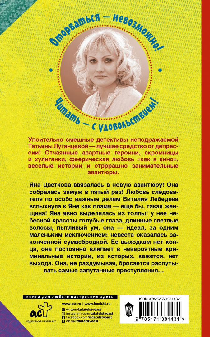 ОписаниеЯна Цветкова ввязалась в новую авантюру! Она собралась замуж в пятый раз! Любовь следователя по особо важным делам Виталия Лебедева вспыхнула к Яне как пламя - еще бы такая женщина! Яна явно выделялась из толпы: у нее небесной красоты голубые глаза, длинные светлые волосы, пытливый ум, она - идеал, за одним маленьким исключением: невеста оказалась законченной сумасбродкой. Ее выходкам нет конца, она постоянно влипает в невероятные криминальные истории, из которых, кажется, нет выхода. Она, не раздумывая, бросается распутывать самые запутанные преступления…Яна Цветкова ввязалась в новую авантюру! Она собралась замуж в пятый раз! Любовь следователя по особо важным делам Виталия Лебедева вспыхнула к Яне как пламя - еще бы такая женщина! Яна явно выделялась из толпы: у нее небесной красоты голубые глаза, длинные светлые волосы, пытливый ум, она - идеал, за одним маленьким исключением: невеста оказалась законченной сумасбродкой. Ее выходкам нет конца, она постоянно влипает в невероятные криминальные истории, из которых, кажется, нет выхода. Она, не раздумывая, бросается распутывать самые запутанные преступления…