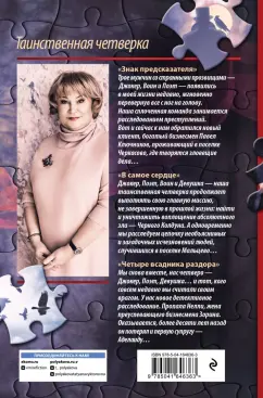 ОписаниеЗнаменитая Татьяна Полякова закрутила сюжет в своей фирменной, любимой читателями манере: вас ждет много тайн, неожиданных поворотов и интригующая развязка. Не пропустите авторский цикл "Таинственная четверка", в который входят остросюжетные романы "Знак предсказателя", "В самое сердце", "Четыре всадника раздора", повествующие о приключениях Девушки, Джокера, Поэта и Воина. Трое мужчин со странными прозвищами - Джокер, Воин и Поэт - появились в моей жизни недавно, мгновенно перевернув все с ног на голову. Наша сплоченная команда занимается расследованием преступлений. Вот и сейчас к нам обратился новый клиент, богатый бизнесмен Павел Ключников, проживающий в поселке Черкасово, где творятся зловещие дела… Джокер, Поэт, Воин и Девушка - наша таинственная четверка продолжает выполнять свою главную миссию, не завершенную в прошлой жизни: найти и уничтожить воплощение абсолютного зла - Черного Колдуна. А одновременно мы расследуем цепочку необъяснимых и загадочных исчезновений людей, случившихся в поселке Мальцево… Мы снова вместе, нас четверо - Джокер, Поэт, Девушка… и тот, кого совсем недавно мы считали своим врагом. У нас новое детективное расследование. Пропала Нелли, жена преуспевающего бизнесмена Зорина. Оказывается, более десяти лет назад он потерял и первую супругу - Аделаиду…СвернутьЗнаменитая Татьяна Полякова закрутила сюжет в своей фирменной, любимой читателями манере: вас ждет много тайн, неожиданных поворотов и интригующая развязка. Не пропустите авторский цикл "Таинственная четверка", в который входят остросюжетные романы "Знак предсказателя", "В самое сердце", "Четыре всадника раздора", повествующие о приключениях Девушки, Джокера, Поэта и Воина. Трое мужчин со странными прозвищами - Джокер, Воин и Поэт - появились в моей жизни недавно, мгновенно перевернув все с ног на голову. Наша сплоченная команда занимается расследованием преступлений. Вот и сейчас к нам обратился новый клиент, богатый бизнесмен Павел Ключников, проживающий в поселке Черкасово, где творятся зловещие дела… Джокер, Поэт, Воин и Девушка - наша таинственная четверка продолжает выполнять свою главную миссию, не завершенную в прошлой жизни: найти и уничтожить воплощение абсолютного зла - Черного Колдуна. А одновременно мы расследуем цепочку необъяснимых и загадочных исчезновений людей, случившихся в поселке Мальцево… Мы снова вместе, нас четверо - Джокер, Поэт, Девушка… и тот, кого совсем недавно мы считали своим врагом. У нас новое детективное расследование. Пропала Нелли, жена преуспевающего бизнесмена Зорина. Оказывается, более десяти лет назад он потерял и первую супругу - Аделаиду…СвернутьСвернуть