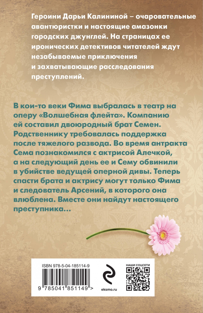 ОписаниеВ кои-то веки Фима выбралась в театр на оперу "Волшебная флейта". Компанию ей составил двоюродный брат Семен. Родственнику требовалась поддержка после тяжелого развода. Во время антракта Сема познакомился с актрисой Алечкой, а на следующий день ее и Сему обвинили в убийстве ведущей оперной дивы. Теперь спасти брата и актрису могут только Фима и следователь Арсений, в которого она влюблена. Вместе они найдут настоящего преступника…В кои-то веки Фима выбралась в театр на оперу "Волшебная флейта". Компанию ей составил двоюродный брат Семен. Родственнику требовалась поддержка после тяжелого развода. Во время антракта Сема познакомился с актрисой Алечкой, а на следующий день ее и Сему обвинили в убийстве ведущей оперной дивы. Теперь спасти брата и актрису могут только Фима и следователь Арсений, в которого она влюблена. Вместе они найдут настоящего преступника…