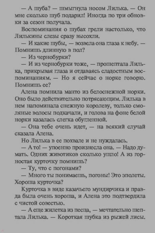 ОписаниеНа что только не пойдет настоящая женщина ради новой шубы! В горящую избу войдет, начальника грудью прикроет, от шоппинга откажется. Да что там, ради шубы такая как Лиля даже замуж готова. Причем не за кого-нибудь, а только за директора шубного магазина или за владельца фабрики, где шьют эти легчайшие жакетки, манто, шубки и курточки. Но новую шубу к празднику хочется не ей одной, и как быть, если соперницы готовы даже на криминал ради союза с меховым мужчиной, которого Лиля уже присмотрела себе в мужья?..На что только не пойдет настоящая женщина ради новой шубы! В горящую избу войдет, начальника грудью прикроет, от шоппинга откажется. Да что там, ради шубы такая как Лиля даже замуж готова. Причем не за кого-нибудь, а только за директора шубного магазина или за владельца фабрики, где шьют эти легчайшие жакетки, манто, шубки и курточки. Но новую шубу к празднику хочется не ей одной, и как быть, если соперницы готовы даже на криминал ради союза с меховым мужчиной, которого Лиля уже присмотрела себе в мужья?..