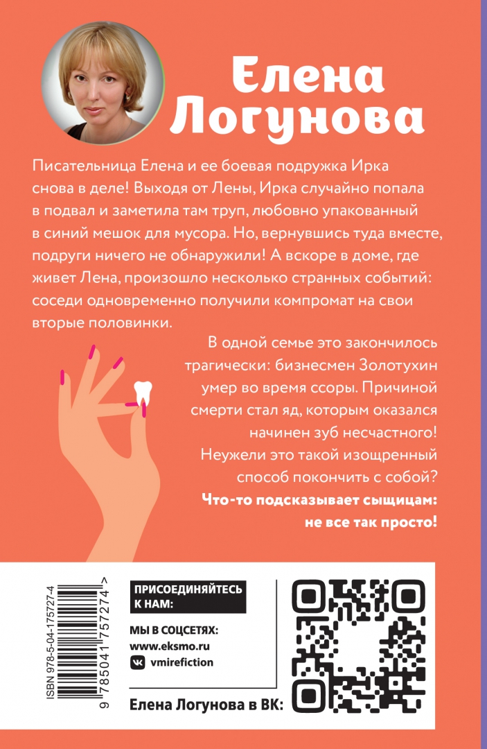 ОписаниеПисательница Елена и ее боевая подружка Ирка снова в деле! Выходя от Лены, Ирка случайно попала в подвал и заметила там труп, любовно упакованный в синий мешок для мусора. Но, вернувшись туда вместе, подруги ничего не обнаружили! А вскоре в доме, где живет Лена, произошло несколько странных событий: соседи одновременно получили компромат на свои вторые половинки. В одной семье это закончилось трагически: бизнесмен Золотухин умер во время ссоры. Причиной смерти стал яд, которым оказался начинен зуб несчастного! Неужели это такой изощренный способ покончить с собой? Что-то подсказывает сыщицам: не все так просто!Бывшая тележурналистка, ныне писательница Лена и ее неунывающая подружка Ирка - героини многих иронических детективов Елены Логуновой. В ее новом остросюжетном романе "Маска, я вас знаю!" они снова берутся за свое! Ведь дамы просто жить не могут без криминальных приключений.Писательница Елена и ее боевая подружка Ирка снова в деле! Выходя от Лены, Ирка случайно попала в подвал и заметила там труп, любовно упакованный в синий мешок для мусора. Но, вернувшись туда вместе, подруги ничего не обнаружили! А вскоре в доме, где живет Лена, произошло несколько странных событий: соседи одновременно получили компромат на свои вторые половинки. В одной семье это закончилось трагически: бизнесмен Золотухин умер во время ссоры. Причиной смерти стал яд, которым оказался начинен зуб несчастного! Неужели это такой изощренный способ покончить с собой? Что-то подсказывает сыщицам: не все так просто!Бывшая тележурналистка, ныне писательница Лена и ее неунывающая подружка Ирка - героини многих иронических детективов Елены Логуновой. В ее новом остросюжетном романе "Маска, я вас знаю!" они снова берутся за свое! Ведь дамы просто жить не могут без криминальных приключений.