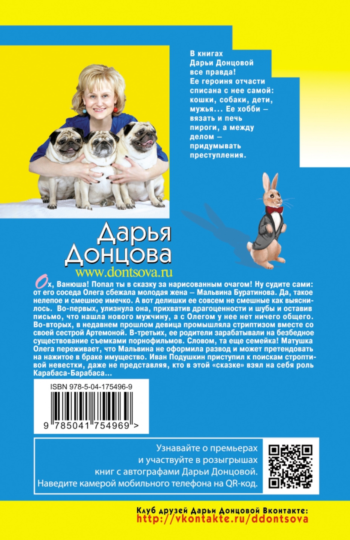 ОписаниеОх, Ванюша! Попал ты в сказку за нарисованным очагом! Ну, судите сами: от его соседа Олега сбежала молодая жена - Мальвина Буратинова. Да, такое нелепое и смешное имечко. А вот делишки ее совсем не смешные, как выяснилось. Во-первых, улизнула она, прихватив драгоценности и шубы и оставив письмо, что нашла нового мужчину, а с Олегом у нее нет ничего общего. Во-вторых, в недавнем прошлом девица промышляла стриптизом вместе со своей сестрой Артемоной. В-третьих, ее родители зарабатывали на безбедное существование съемками порнофильмов. Словом, та еще семейка! Матушка Олега переживает, что Мальвина не оформила развод и может претендовать на нажитое в браке имущество. Иван Подушкин приступил к поискам строптивой невестки, даже не представляя, кто в этой "сказке" взял на себя роль Карабаса-Барабаса… Дарья Донцова - самый популярный и востребованный автор в нашей стране, любимица миллионов читателей. В России продано более 200 миллионов экземпляров ее книг. Детективы Дарьи Донцовой написаны в особой манере: помимо интереснейшего сюжета, в них всегда присутствует тонкий юмор, здравый оптимизм и безусловная вера в торжество добра над злом. Это всё, что нужно для отдыха, релаксации и душевного успокоения. Прочтите книги Дарьи, и ваши сердца и души наполнятся светом, оптимизмом, радостью, уверенностью в завтрашнем дне! Они заразят вас желанием жить, радоваться каждому дню и верить в лучшее. "Донцова невероятная работяга! Я не знаю ни одного другого писателя, который столько работал бы. Я отношусь к ней с уважением, как к образцу писательского трудолюбия. Женщины нуждаются в психологической поддержке и получают ее от Донцовой. Я и сама в свое время прочла несколько романов Донцовой. Ее читают очень разные люди. И очень занятые бизнес-леди, чтобы на время выключить голову, и домохозяйки, у которых есть перерыв 15-20 минут между отвести-забрать детей". - Галина Юзефович, литературный критик "У Дарьи вся детективная закваска всего лишь фон для раскрытия характеров, взаимоотношений между людьми. Всегда есть интрига, и до последнего эпизода непонятно, что, как и почему. В этом смысле условия жанра абсолютно выполняются. Дарья Донцова, конечно, одна из лучших". - Дмитрий Харатьян "Давно начала читать, и так втянулась! И сейчас читаю романы Дарьи. Я отдыхаю за ними. Сама Донцова интеллигентная женщина, у нее мягкий юмор и нестрашный сюжет, все с позитивом и надеждой на хороший конец. Это прекрасно". - Лариса УдовиченкоСвернутьОх, Ванюша! Попал ты в сказку за нарисованным очагом! Ну, судите сами: от его соседа Олега сбежала молодая жена - Мальвина Буратинова. Да, такое нелепое и смешное имечко. А вот делишки ее совсем не смешные, как выяснилось. Во-первых, улизнула она, прихватив драгоценности и шубы и оставив письмо, что нашла нового мужчину, а с Олегом у нее нет ничего общего. Во-вторых, в недавнем прошлом девица промышляла стриптизом вместе со своей сестрой Артемоной. В-третьих, ее родители зарабатывали на безбедное существование съемками порнофильмов. Словом, та еще семейка! Матушка Олега переживает, что Мальвина не оформила развод и может претендовать на нажитое в браке имущество. Иван Подушкин приступил к поискам строптивой невестки, даже не представляя, кто в этой "сказке" взял на себя роль Карабаса-Барабаса… Дарья Донцова - самый популярный и востребов