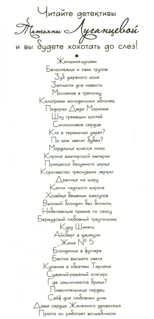---Татьяна Луганцева: Просто он работает волшебникомРусская классическая и современная литератураДетектив. Остросюжетная литератураЗарубежная художественная литератураРусская художественная литератураФэнтезиДраматургияПоэзияПриключенияФантастикаЭпос и фольклорКлассическая прозаАфоризмыИсторическая прозаДетективыБасниСентиментальная прозаОтечественный боевикСовременная прозаМолодежная литератураЗарубежная классическая и современная литература