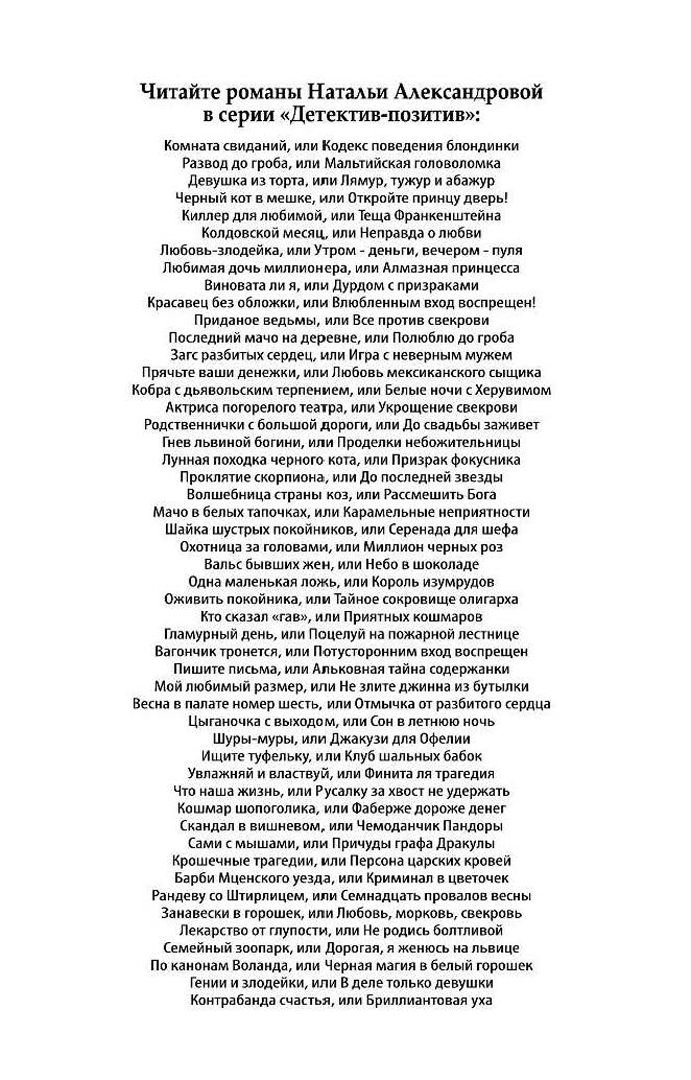 Объем, стр. 320 ISBN 978-5-04-098636-1 Автор Александрова Наталья Николаевна Серия Детектив-позитив Минимальный возраст 16+ Год издания книги 2018 Тип обложки Мягкий переплет Иллюстрации Без иллюстраций Вес, г 132г Размеры 165х105х21 мм - Отзывы