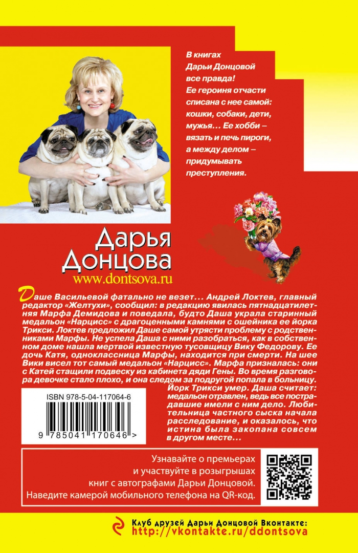 ОписаниеДаше Васильевой фатально не везет... Андрей Локтев, главный редактор "Желтухи", сообщил: в редакцию явилась пятнадцатилетняя Марфа Демидова и поведала, будто Даша украла старинный медальон "Нарцисс" с драгоценными камнями с ошейника ее йорка Трикси. Локтев предложил Даше самой утрясти проблему с родственниками Марфы. Не успела Даша с ними разобраться, как в собственном доме нашли мертвой известную тусовщицу Вику Федорову. Ее дочь Катя, одноклассница Марфы, находится при смерти. На шее Вики висел тот самый медальон "Нарцисс". Марфа призналась: они с Катей стащили подвеску из кабинета дяди Гены. Во время разговора девочке стало плохо, и она следом за подругой попала в больницу. Йорк Трикси умер. Даша считает: медальон отравлен, ведь все пострадавшие имели с ним дело. Любительница частного сыска начала расследование, и оказалось, что истина была закопана совсем в другом месте... Дарья Донцова — самый популярный и востребованный автор в нашей стране, любимица миллионов читателей.