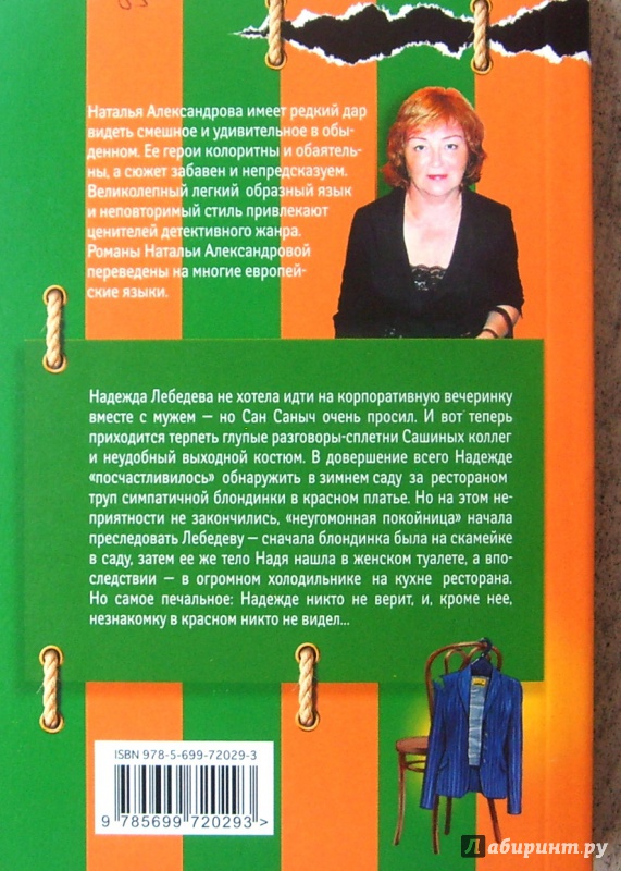 ОписаниеНадежда Лебедева не хотела идти на корпоративную вечеринку вместе с мужем - но Сан Саныч очень просил. И вот теперь приходится терпеть глупые разговоры - сплетни Сашиных коллег и неудобный выходной костюм. В довершении всего Надежде "посчастливилось" обнаружить в Зимнем саду за рестораном труп симпатичной блондинки в красном платье. Но на этом неприятности не закончились, "неугомонная покойница" начала преследовать Лебедеву - сначала блондинка была на скамейке в саду, затем ее же тело Надя нашла в женском туалете, а впоследствии - в огромном холодильнике на кухне ресторана. Но самое печальное: Надежде никто не верит, и кроме нее незнакомку в красном никто не видел...Надежда Лебедева не хотела идти на корпоративную вечеринку вместе с мужем - но Сан Саныч очень просил. И вот теперь приходится терпеть глупые разговоры - сплетни Сашиных коллег и неудобный выходной костюм. В довершении всего Надежде "посчастливилось" обнаружить в Зимнем саду за рестораном труп симпатичной блондинки в красном платье. Но на этом неприятности не закончились, "неугомонная покойница" начала преследовать Лебедеву - сначала блондинка была на скамейке в саду, затем ее же тело Надя нашла в женском туалете, а впоследствии - в огромном холодильнике на кухне ресторана. Но самое печальное: Надежде никто не верит, и кроме нее незнакомку в красном никто не видел...