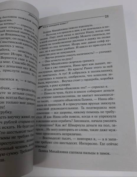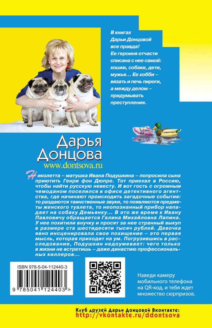 СвернутьНиколетта — матушка Ивана Подушкина – попросила сына приютить Генри фон Дюпре. Тот приехал в Россию, чтобы найти русскую невесту. И вот гость с огромным чемоданом поселился в офисе детективного агентства, где начинают происходить загадочные события: то раздаются таинственные звуки, то появляются предметы женского туалета, то неопознанный прибор нападает на собаку Демьянку… В это же время к Ивану Павловичу обращается Галина Михайловна Лапина. У нее похитили внучку и просят за нее странный выкуп в размере ста шестидесяти тысяч рублей. Девочка явно инсценировала свое похищение – это первая мысль, которая приходит на ум. Погрузившись в расследование, Подушкин недоумевает: чего только в жизни не встретишь – даже династию профессиональных киллеров…Дарья Донцова — самый популярный и востребованный автор в нашей стране, любимица миллионов читателей.
