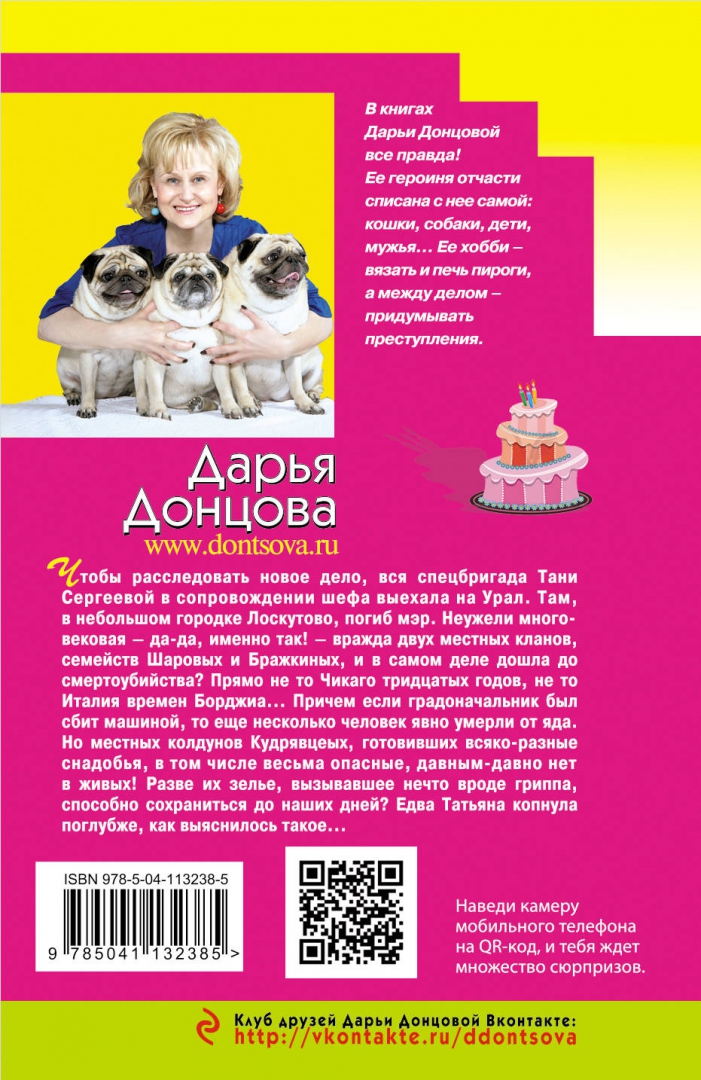 сюжет, всё с позитивом и надеждой на хороший конец. Это прекрасно». — Лариса УдовиченкоСвернутьЧтобы расследовать новое дело, вся спецбригада Тани Сергеевой, в сопровождении шефа, выехала на Урал. Там, в небольшом городке Лоскутово, погиб мэр. Неужели многовековая – да-да, именно так! – вражда двух местных кланов, семейств Шаровых и Бражкиных, и в самом деле дошла до смертоубийства? Прямо не то Чикаго тридцатых годов, не то Италия времен Борджиа... Причем если градоначальник был сбит машиной, то еще несколько человек явно умерли от яда. Но местных колдунов Кудрявцеых, готовивших всяко-разные снадобья, в том числе весьма опасные, давным-давно нет в живых! Разве их зелье, вызывавшее нечто вроде гриппа, способно сохраниться до наших дней? Едва Татьяна копнула поглубже, как выяснилось такое...Дарья Донцова — самый популярный и востребованный автор в нашей стране, любимица миллионов читателей.