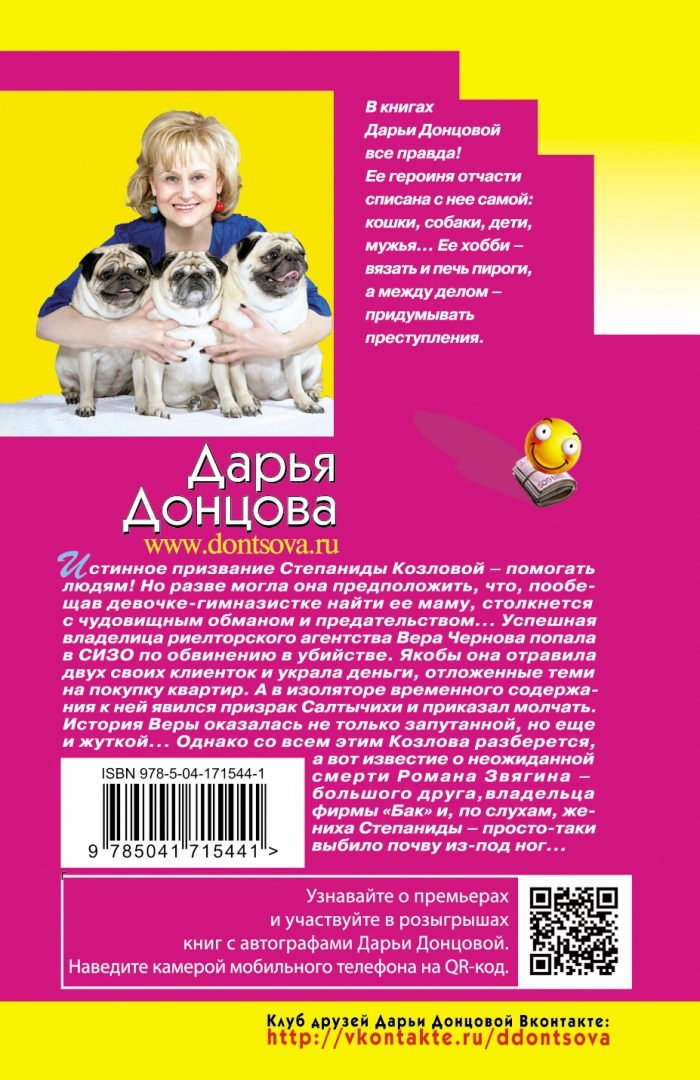 ОписаниеИстинное призвание Степаниды Козловой — помогать людям! Но разве могла она предположить, что, пообещав девочке-гимназистке найти ее маму, столкнется с чудовищным обманом и предательством... Успешная владелица риелторского агентства Вера Чернова попала в СИЗО по обвинению в убийстве. Якобы она отравила двух своих клиенток и украла деньги, отложенные теми на покупку квартир. А в изоляторе временного заключения к ней явился призрак Салтычихи и приказал молчать. История Веры оказалась не только запутанной, но еще и жуткой... Однако со всем этим Козлова разберется, а вот известие о неожиданной смерти Романа Звягина — большого друга, владельца фирмы «Бак» и, по слухам, жениха Степаниды — просто-таки выбило почву из-под ног... Дарья Донцова — самый популярный и востребованный автор в нашей стране, любимица миллионов читателей. В России продано более 200 миллионов экземпляров ее книг. Детективы Дарьи Донцовой написаны в особой манере: помимо интереснейшего сюжета, в них всегда присутствует тонкий юмор, здравый оптимизм и безусловная вера в торжество добра над злом. Это всё, что нужно для отдыха, релаксации и душевного успокоения. Прочтите книги Дарьи, и ваши сердца и души наполнятся светом, оптимизмом, радостью, уверенностью в завтрашнем дне! Они заразят вас желанием жить, радоваться каждому дню и верить в лучшее. «Донцова невероятная работяга! Я не знаю ни одного другого писателя, который столько работал бы. Я отношусь к ней с уважением, как к образцу писательского трудолюбия. Женщины нуждаются в психологической поддержке и получают ее от Донцовой. Я и сама в свое время прочла несколько романов Донцовой. Ее читают очень разные люди. И очень занятые бизнес-леди, чтобы на время выключить голову, и домохозяйки, у которых есть перерыв 15—20 минут между отвести-забрать детей». — Галина Юзефович, литературный критик «У Дарьи вся детективная закваска всего лишь фон для раскрытия характеров, взаимоотношений между людьми. Всегда есть интрига, и до последнего эпизода непонятно, что, как и почему. В этом смысле условия жанра абсолютно выполняются. Дарья Донцова, конечно, одна из лучших». — Дмитрий Харатьян «Давно начала читать, и так втянулась! И сейчас читаю романы Дарьи. Я отдыхаю за ними. Сама Донцова интеллигентная женщина, у нее мягкий юмор и нестрашный сюжет, все с позитивом и надеждой на хороший конец. Это прекрасно». — Лариса УдовиченкоСвернутьИстинное призвание Степаниды Козловой — помогать людям! Но разве могла она предположить, что, пообещав девочке-гимназистке найти ее маму, столкнется с чудовищным обманом и предательством... Успешная владелица риелторского агентства Вера Чернова попала в СИЗО по обвинению в убийстве. Якобы она отравила двух своих клиенток и украла деньги, отложенные теми на покупку квартир. А в изоляторе временного заключения к ней явился призрак Салтычихи и приказал молчать. История Веры оказалась не только запутанной, но еще и жуткой... Однако со всем этим Козлова разберется, а вот известие о неожиданной смерти Романа Звягина — большого друга, владельца фирмы «Бак» и, по слухам, жениха Степаниды — просто-таки выбило почву из-под ног... Дарья Донцова — самый популярный и востребованный автор в нашей стране, любимица миллионов читателей. В России продано более 200 миллионов экземпляров ее книг. Детективы Дарь