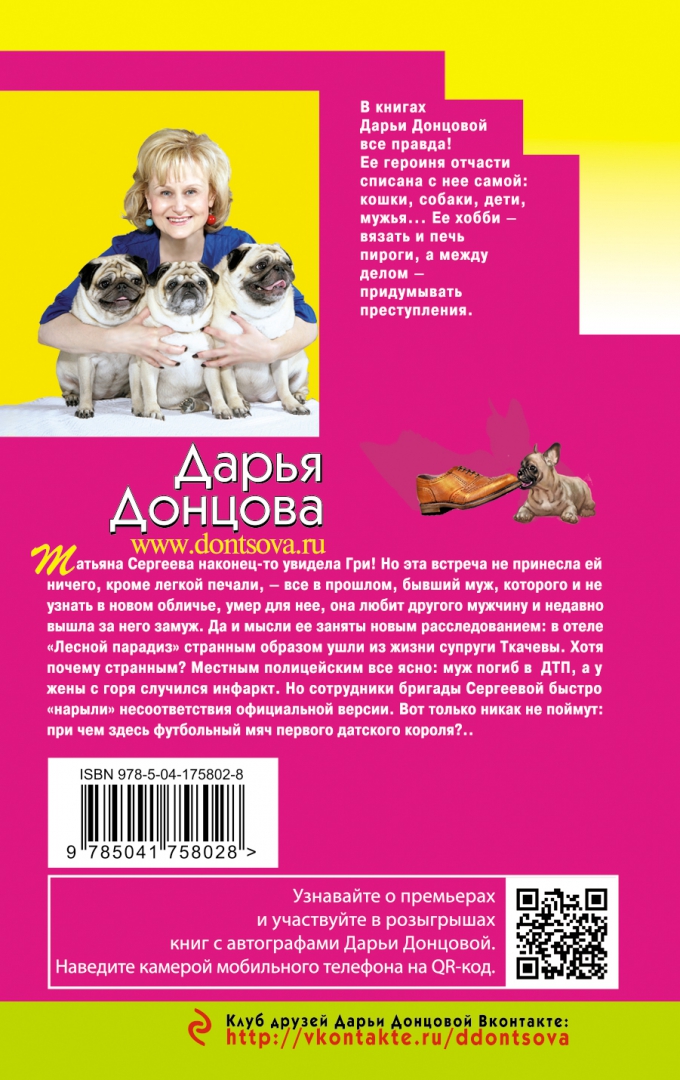 ОписаниеТатьяна Сергеева наконец-то увидела Гри! Но эта встреча не принесла ей ничего, кроме легкой печали — все в прошлом, бывший муж, которого и не узнать в новом обличье, умер для нее, она любит другого мужчину и недавно вышла за него замуж. Да и мысли ее заняты новым расследованием: в отеле «Лесной парадиз» странным образом ушли из жизни супруги Ткачевы. Хотя почему странным? Местным полицейским все ясно: муж погиб в ДТП, а у жены с горя случился инфаркт. Но сотрудники бригады Сергеевой быстро «нарыли» несоответствия официальной версии. Вот только никак не поймут: при чем здесь футбольный мяч первого датского короля?.. Дарья Донцова — самый популярный и востребованный автор в нашей стране, любимица миллионов читателей. В России продано более 200 миллионов экземпляров ее книг. Детективы Дарьи Донцовой написаны в особой манере: помимо интереснейшего сюжета, в них всегда присутствует тонкий юмор, здравый оптимизм и безусловная вера в торжество добра над злом. Это всё, что нужно для отдыха, релаксации и душевного успокоения. Прочтите книги Дарьи, и ваши сердца и души наполнятся светом, оптимизмом, радостью, уверенностью в завтрашнем дне! Они заразят вас желанием жить, радоваться каждому дню и верить в лучшее. «Донцова невероятная работяга! Я не знаю ни одного другого писателя, который столько работал бы. Я отношусь к ней с уважением, как к образцу писательского трудолюбия. Женщины нуждаются в психологической поддержке и получают ее от Донцовой. Я и сама в свое время прочла несколько романов Донцовой. Ее читают очень разные люди. И очень занятые бизнес-леди, чтобы на время выключить голову, и домохозяйки, у которых есть перерыв 15—20 минут между отвести-забрать детей». — Галина Юзефович, литературный критик «У Дарьи вся детективная закваска всего лишь фон для раскрытия характеров, взаимоотношений между людьми. Всегда есть интрига, и до последнего эпизода непонятно, что, как и почему. В этом смысле условия жанра абсолютно выполняются. Дарья Донцова, конечно, одна из лучших». — Дмитрий Харатьян «Давно начала читать, и так втянулась! И сейчас читаю романы Дарьи. Я отдыхаю за ними. Сама Донцова интеллигентная женщина, у нее мягкий юмор и нестрашный сюжет, все с позитивом и надеждой на хороший конец. Это прекрасно». — Лариса УдовиченкоСвернутьТатьяна Сергеева наконец-то увидела Гри! Но эта встреча не принесла ей ничего, кроме легкой печали — все в прошлом, бывший муж, которого и не узнать в новом обличье, умер для нее, она любит другого мужчину и недавно вышла за него замуж. Да и мысли ее заняты новым расследованием: в отеле «Лесной парадиз» странным образом ушли из жизни супруги Ткачевы. Хотя почему странным? Местным полицейским все ясно: муж погиб в ДТП, а у жены с горя случился инфаркт. Но сотрудники бригады Сергеевой быстро «нарыли» несоответствия официальной версии. Вот только никак не поймут: при чем здесь футбольный мяч первого датского короля?.. Дарья Донцова — самый популярный и востребованный автор в нашей стране, любимица миллионов читателей. В России продано более 200 миллионов экземпляров ее книг. Детективы Дарьи Донцовой написаны в особой манере: помимо интереснейшего сюжета, в них всегда присутствует тонкий юмор, здравый оптимизм и безусловная вера в торжество добра над злом. Это всё, что нужно для отдыха, релаксации и душевного 