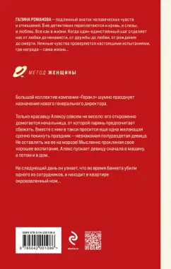 ОписаниеБольшой коллектив компании "Геракл" шумно празднует назначение нового генерального директора. Только красавцу Алексу совсем не весело: его откровенно домогается начальница, от которой парень предпочитает сбежать. Вместе с ним в такси просится еще одна желающая срочно покинуть праздник - незнакомая полураздетая девица. Не оставлять же ее на морозе! Мысленно проклиная свое хорошее воспитание, Алекс пускает девицу сначала в машину, а потом и в дом. На следующий день он узнает, что во время банкета убили одного из сотрудников, и находит в квартире окровавленный нож… Галина Романова - подлинный знаток человеческих чувств и отношений. В ее детективных мелодрамах из серии "Метод женщины" переплетаются и кровь, и слезы, и любовь. Все, как в реальности, когда один-единственный шаг отделяет нас от любви до ненависти, от дружбы до любви, от рождения до смерти. Нежные чувства проверяются настоящими испытаниями, где награда - сама жизнь.Большой коллектив компании "Геракл" шумно празднует назначение нового генерального директора. Только красавцу Алексу совсем не весело: его откровенно домогается начальница, от которой парень предпочитает сбежать. Вместе с ним в такси просится еще одна желающая срочно покинуть праздник - незнакомая полураздетая девица. Не оставлять же ее на морозе! Мысленно проклиная свое хорошее воспитание, Алекс пускает девицу сначала в машину, а потом и в дом. На следующий день он узнает, что во время банкета убили одного из сотрудников, и находит в квартире окровавленный нож… Галина Романова - подлинный знаток человеческих чувств и отношений. В ее детективных мелодрамах из серии "Метод женщины" переплетаются и кровь, и слезы, и любовь. Все, как в реальности, когда один-единственный шаг отделяет нас от любви до ненависти, от дружбы до любви, от рождения до смерти. Нежные чувства проверяются настоящими испытаниями, где награда - сама жизнь.