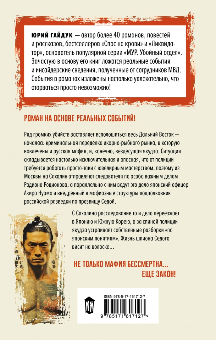 ОписаниеРоман на основе реальных событий!Ряд громких убийств заставляет всполошиться весь Дальний Восток - началась криминальная переделка икорно-рыбного рынка, в которую вовлечены и русская мафия, и, конечно, вездесущая якудза. Ситуация складывается настолько исключительная и опасная, что от полиции требуется работать просто-таки с ювелирным мастерством, поэтому из Москвы на Сахалин отправляют следователя по особо важным делам Родиона Родионова, а параллельно с ним ведут это дело японский офицер Акира Нуамо и внедренный в мафиозные структуры подполковник российской разведки по прозвищу Седой.С Сахалина расследование то и дело переезжает в Японию и Южную Корею, а за спиной полиции якудза устраивает собственные разборки "по японским понятиям". Жизнь шпиона Седого висит на волоске…Роман на основе реальных событий!Ряд громких убийств заставляет всполошиться весь Дальний Восток - началась криминальная переделка икорно-рыбного рынка, в которую вовлечены и русская мафия, и, конечно, вездесущая якудза. Ситуация складывается настолько исключительная и опасная, что от полиции требуется работать просто-таки с ювелирным мастерством, поэтому из Москвы на Сахалин отправляют следователя по особо важным делам Родиона Родионова, а параллельно с ним ведут это дело японский офицер Акира Нуамо и внедренный в мафиозные структуры подполковник российской разведки по прозвищу Седой.С Сахалина расследование то и дело переезжает в Японию и Южную Корею, а за спиной полиции якудза устраивает собственные разборки "по японским понятиям". Жизнь шпиона Седого висит на волоске…
