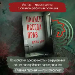ОписаниеАлександра - опытный психотерапевт. Марк - ее сложный пациент. Он не может смириться с гибелью девушки и вопреки всем фактам верит, что она жива. В ходе терапии Марк все больше нравится Александре. А еще - становится главным подозреваемым в убийстве своей девушки. Кто же он такой, Марк Берн? Новый закрученный триллер для поклонников "Безмолвного пациента" и психиатрических триллеров! Сложные взаимоотношения врача и пациента, нераскрытое преступление и сильные неконтролируемые чувства… Которые могут довести до новой беды. Ирэна Берн - криминалист, писатель. Психологический триллер с элементом мелодрамы "Пациент всегда прав" - занял 1 место в конкурсе "True crime, true love" от Эксмо. "Психиатрический триллер о потере дорогого человека и непостижимо упрямой вере, что его можно вернуть. Роман проведет вас по лабиринту событий и версий реальности, показав немало ложных следов, как в настоящей детективной игре". - Лора Кейли, автор бестселлера "Колокол" "Вы любите триллеры, которые заставят вас сомневаться в главном герое? Тогда эта история для вас!" - Екатерина Ирмеш, редакторСвернутьАлександра - опытный психотерапевт. Марк - ее сложный пациент. Он не может смириться с гибелью девушки и вопреки всем фактам верит, что она жива. В ходе терапии Марк все больше нравится Александре. А еще - становится главным подозреваемым в убийстве своей девушки. Кто же он такой, Марк Берн? Новый закрученный триллер для поклонников "Безмолвного пациента" и психиатрических триллеров! Сложные взаимоотношения врача и пациента, нераскрытое преступление и сильные неконтролируемые чувства… Которые могут довести до новой беды. Ирэна Берн - криминалист, писатель. Психологический триллер с элементом мелодрамы "Пациент всегда прав" - занял 1 место в конкурсе "True crime, true love" от Эксмо. "Психиатрический триллер о потере дорогого человека и непостижимо упрямой вере, что его можно вернуть. Роман проведет вас по лабиринту событий и версий реальности, показав немало ложных следов, как в настоящей детективной игре". - Лора Кейли, автор бестселлера "Колокол" "Вы любите триллеры, которые заставят вас сомневаться в главном герое? Тогда эта история для вас!" - Екатерина Ирмеш, редакторСвернутьСвернуть