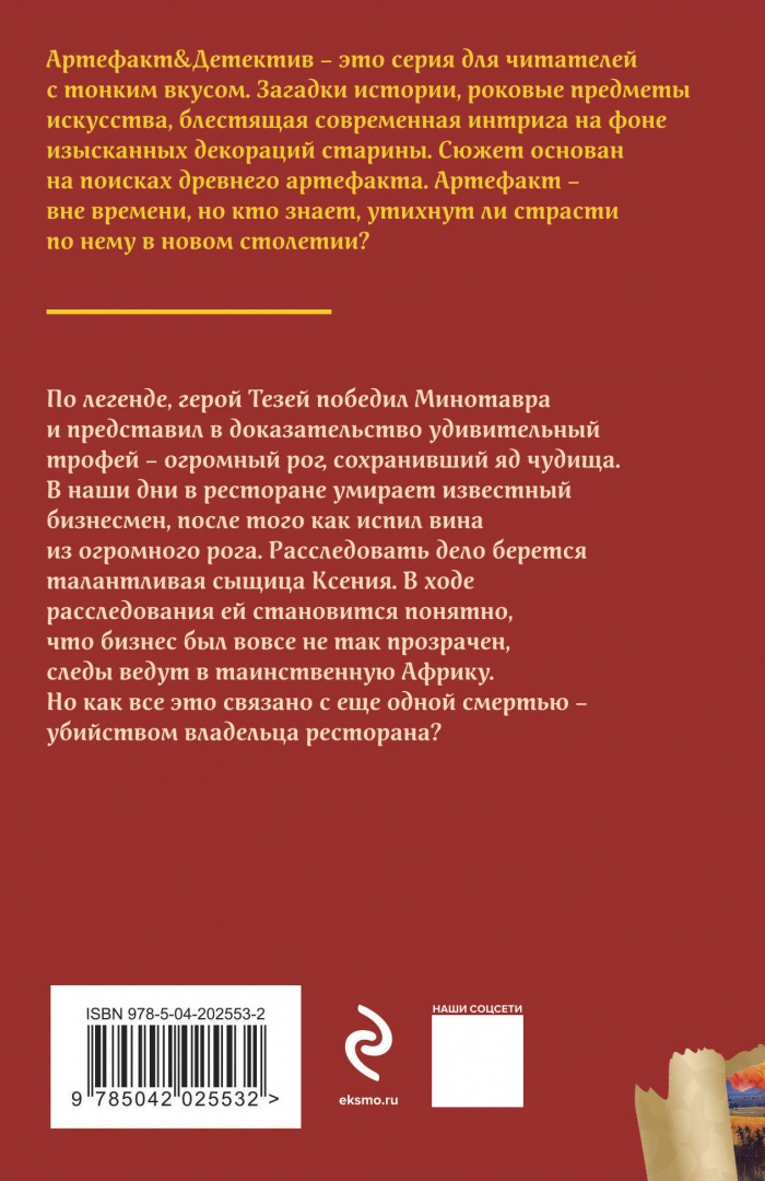 ОписаниеПо легенде, герой Тезей победил Минотавра и представил в доказательство удивительный трофей — огромный рог, сохранивший яд чудища. В наши дни в ресторане умирает известный бизнесмен, после того как испил вина из огромного рога. Расследовать дело берется талантливая сыщица Ксения. В ходе расследования ей становится понятно, что бизнес был вовсе не так прозрачен, следы ведут в таинственную Африку. Но как все это связано с еще одной смертью — убийством владельца ресторана? В этом деле у Ксении появятся не только противники, но и неожиданные друзья, и выведет ли ее интуиция и профессионализм на свет, как некогда нить Ариадны Тезея? Об этом читайте в новом детективе Натальи Александровой «Исчезнувший рог Минотавра».По легенде, герой Тезей победил Минотавра и представил в доказательство удивительный трофей — огромный рог, сохранивший яд чудища. В наши дни в ресторане умирает известный бизнесмен, после того как испил вина из огромного рога. Расследовать дело берется талантливая сыщица Ксения. В ходе расследования ей становится понятно, что бизнес был вовсе не так прозрачен, следы ведут в таинственную Африку. Но как все это связано с еще одной смертью — убийством владельца ресторана? В этом деле у Ксении появятся не только противники, но и неожиданные друзья, и выведет ли ее интуиция и профессионализм на свет, как некогда нить Ариадны Тезея? Об этом читайте в новом детективе Натальи Александровой «Исчезнувший рог Минотавра».
