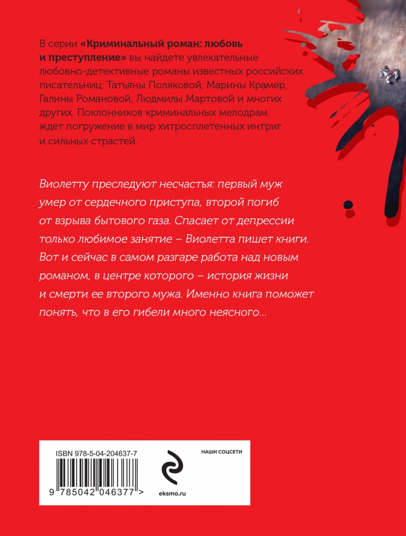ОписаниеВиолетту преследуют несчастья: первый муж умер от сердечного приступа, второй погиб от взрыва бытового газа. Спасает от депрессии только любимое занятие - Виолетта пишет книги. Вот и сейчас в самом разгаре работа над новым романом, в центре которого - история жизни и смерти ее второго мужа. Именно книга поможет понять, что в его гибели много неясного… В детективных мелодрамах Галины Романовой переплелись и кровь, и слезы, и любовь. Все, как в жизни! Нежные чувства проверяются настоящими испытаниями, где награда - сама жизнь. Каждая история по-своему уникальна и не кажется вымыслом! И все они объединены общей темой: настоящая любовь всегда побеждает, а за преступлением непременно следует наказание.Виолетту преследуют несчастья: первый муж умер от сердечного приступа, второй погиб от взрыва бытового газа. Спасает от депрессии только любимое занятие - Виолетта пишет книги. Вот и сейчас в самом разгаре работа над новым романом, в центре которого - история жизни и смерти ее второго мужа. Именно книга поможет понять, что в его гибели много неясного… В детективных мелодрамах Галины Романовой переплелись и кровь, и слезы, и любовь. Все, как в жизни! Нежные чувства проверяются настоящими испытаниями, где награда - сама жизнь. Каждая история по-своему уникальна и не кажется вымыслом! И все они объединены общей темой: настоящая любовь всегда побеждает, а за преступлением непременно следует наказание.